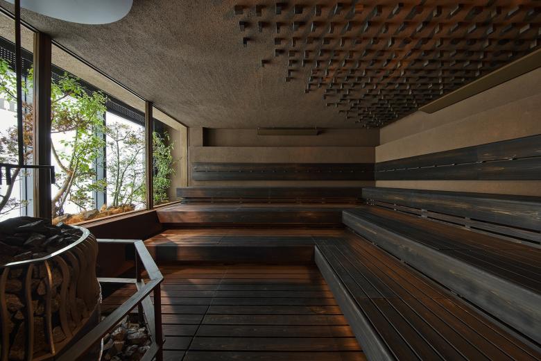 大サウナ室は、一般的な都市型サウナにありがちな閉塞感を取り払い、大きな開口からは坪庭の緑を眺め、その向こうに町の光が柔らかく透けるように配置。