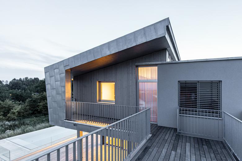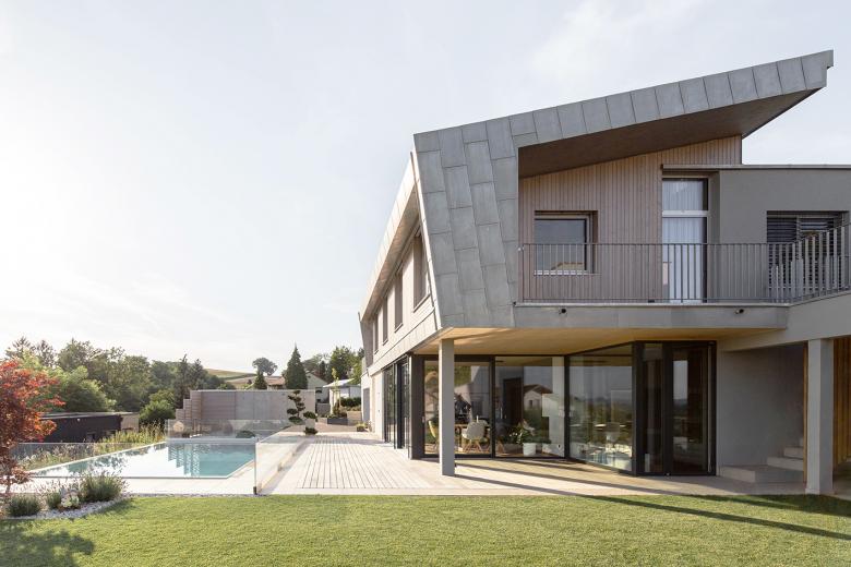 In Zusammenspiel mit den großzügigen Terrassen (auf beiden Ebenen) wird ein offenes Wohnen, mit viel Bezug zur Landschaft und dennoch ein geschützter und heimeliger Außenbereich geschaffen.