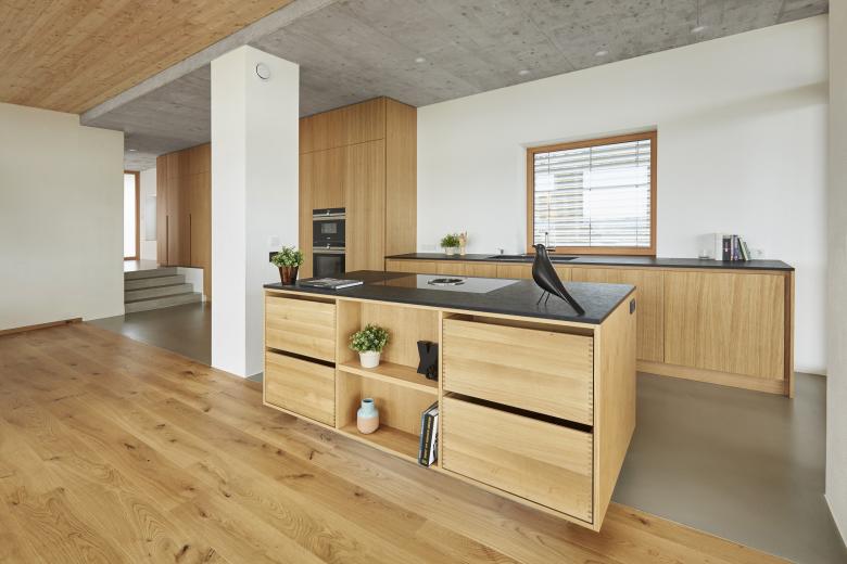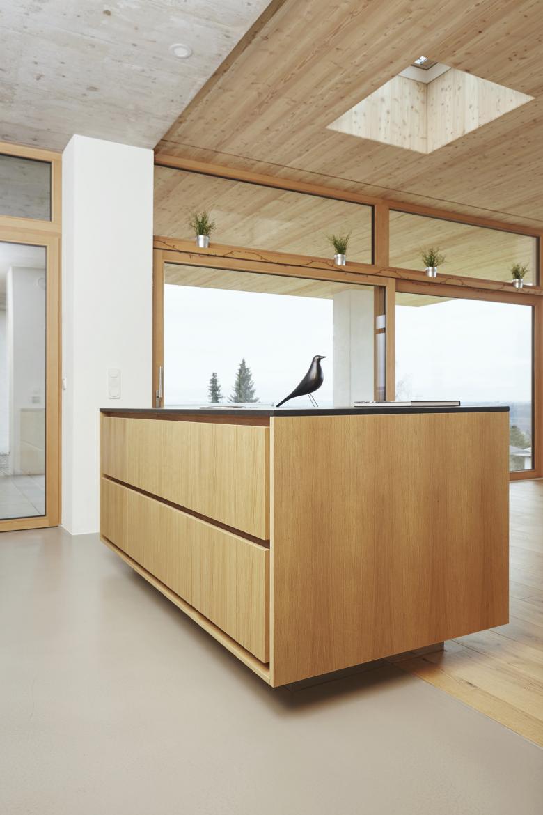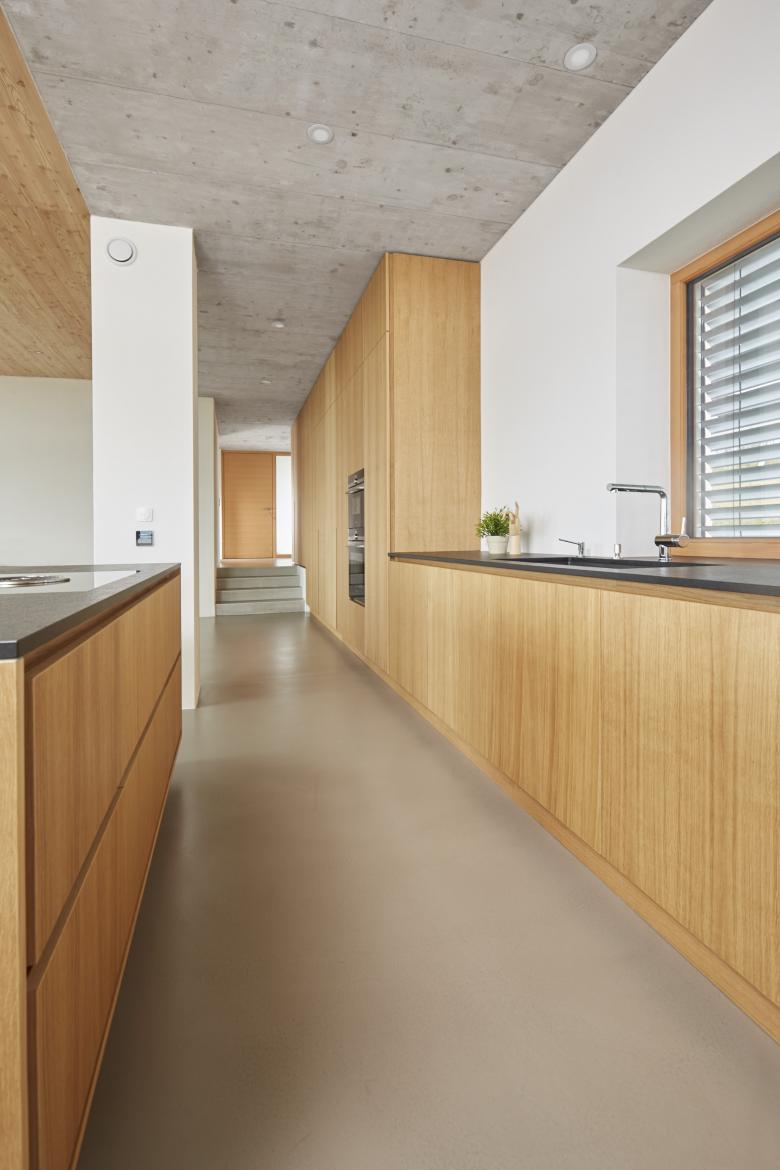 Die innere Raumabfolge entwickelt sich an einer Art Magistrale, wobei diese langestreckte Erschließungszone, gleichzeitig das Rückgrat der nach Süden orientierten Wohn,- und Lebensbereiche bildet. Von der Garage bis zum geschützten Außenbereich werden alle Raumfunktionen über diese interne Wegeachse erschlossen; - durch die Küche gelangt man direkt auf die geschützte Freiterrasse, die einen ungestörten Blick in die Landschaft freigibt.