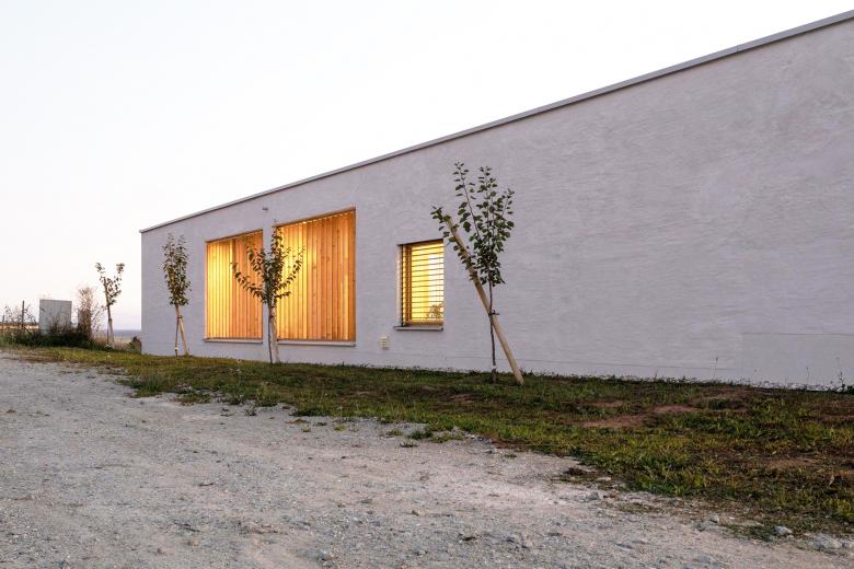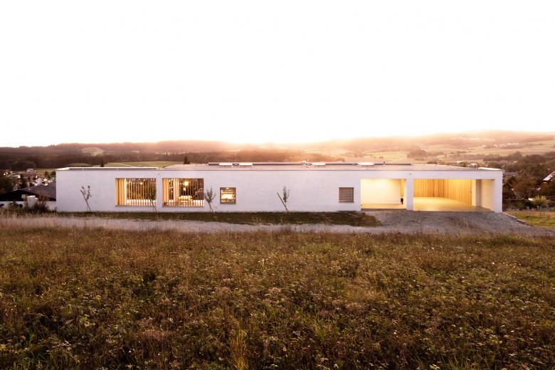 Ein 35 Meter langes Einfamilienhaus, sitzt an der nördlichen Grundgrenze und öffnet sich dem Hangverlauf folgend, Richtung Süden. Die schlanke Figur des Baukörpers begründet sich zum einen aus der Grundstücksform und zum anderen aus der Orientierung nach den Himmelsrichtungen – so entwickelt sich eine klare Linie unter der Vielzahl der umliegenden Bebauungsstrukturen.