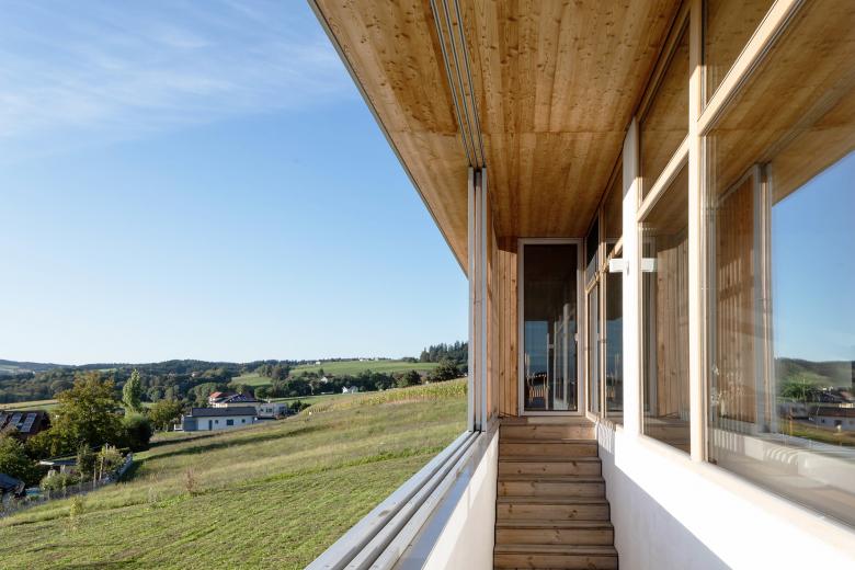 Begleitet wird das gesamte Erdgeschoß von Terrasse, Poolebene und Zugang zu Garten. Diese abgetreppte Terrassenlandschaft führt zu einer "Verlängerung" des Wohnraumes, wodurch die Grenze von Innen und Außen verschwimmt, bzw. Terrasse und Garten zu einem außenliegenden Wohnraum wird.