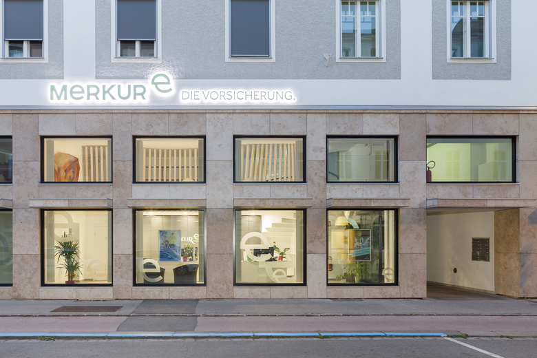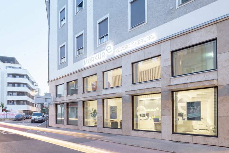 Mit dem Ziel einer harmonischen Einordnung in die Umgebungsarchitektur wurde bei der Neugestaltung der Fassade auch das ursprüngliche Fassadenkonzept aus dem Jahre 1912 analysiert. Die schlichte Steinfassade der ersten beiden Geschoße spricht eine ruhige und unaufgeregte Sprache und greift das damalige und gängige Gestaltungsmittel einer 2-geteilten Fassade auf.