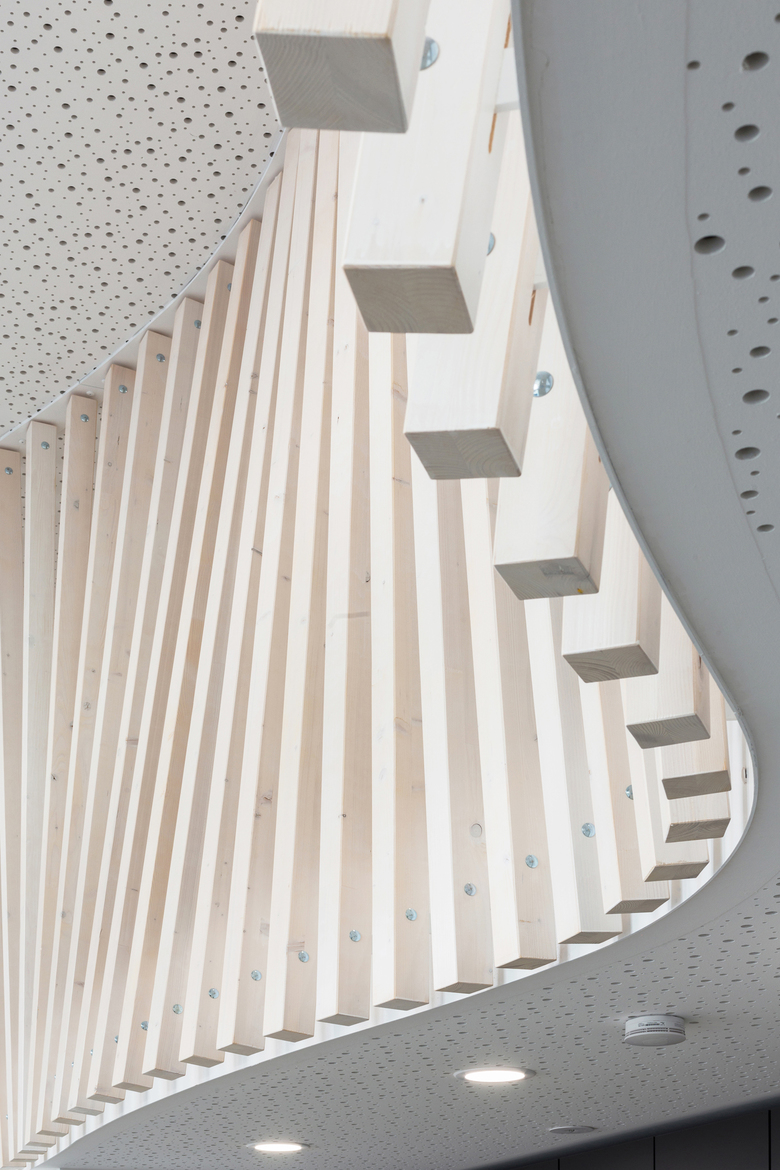 Eine der zentralen Herausforderungen des Innenarchitektur-Projektes war es, den Eingangsbereich neu zu ordnen, um eine freundliche Arbeits- und Empfangsatmosphäre zu schaffen. Ein einfacher aber für das Gesamterscheinungsbild umso wichtiger Eingriff war die räumliche Abtrennung des vorhandenen Galeriebereiches. Zuvor als reiner Gangbereich zu Nebenräumlichkeiten genutzt, wurde dieser nun durch die formale Ausgestaltung zu einem angenehmen und zusätzlichen Aufenthaltsbereich. Ein geschwungener und aus Holzstäben bestehender räumlicher Abschluss, schafft eine aufgelockerte Raumstimmung und bringt den hohen Eingansgbereich in seiner Gesamtheit zur Wirkung.