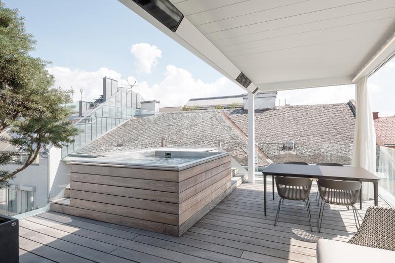 Im Sinne des geltenden Bebauungsplanes wurde jedoch auf eine "einheitliche, durchgehende" Aufstockung (wie bei einem Blockrand) verzichtet und eine differenzierte Höhenentwicklung ausgebildet. Durch diese gestaffelte Dachlandschaft entstehen für die Wohnungen in den Dachgeschossen zugeordnete und geschützte Terrassen. Auf Vorsprünge oder Balkone wird wie im Bestand verzichtet, - die Wohnungen erhalten jedoch eingeschnittene Loggien und großzügige Dachflächenfenster, die Penthouse-Wohnung ein innenliegendes Atrium.