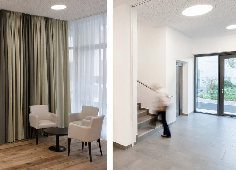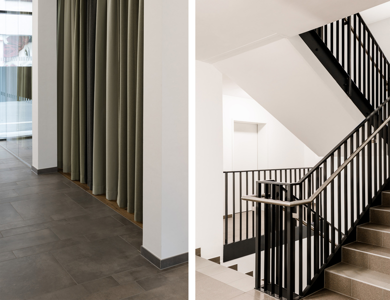 Die Wohnungen im Erdgeschoß befinden sich auf einem Hochparterre und werden über eine Treppe und einem Lift behindertengerecht erschlossen. Das Stiegenhaus ist platzsparend und effizient an der Innenecke des Eckgebäudes situiert und bringt aufgrund seiner großzügigen Verglasung viel Licht in die ohnehin kurz gehalten Gänge, im Zentrum des Gebäudes.