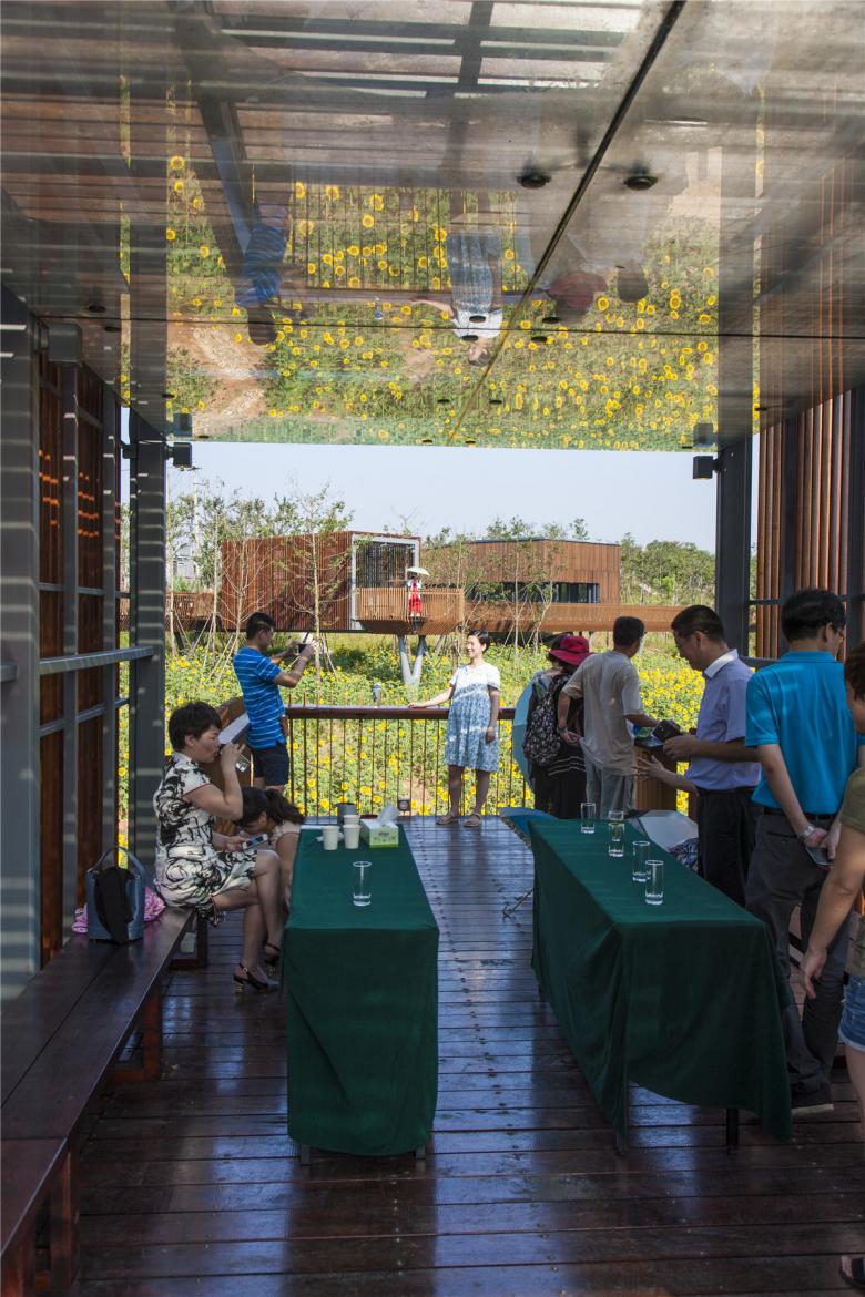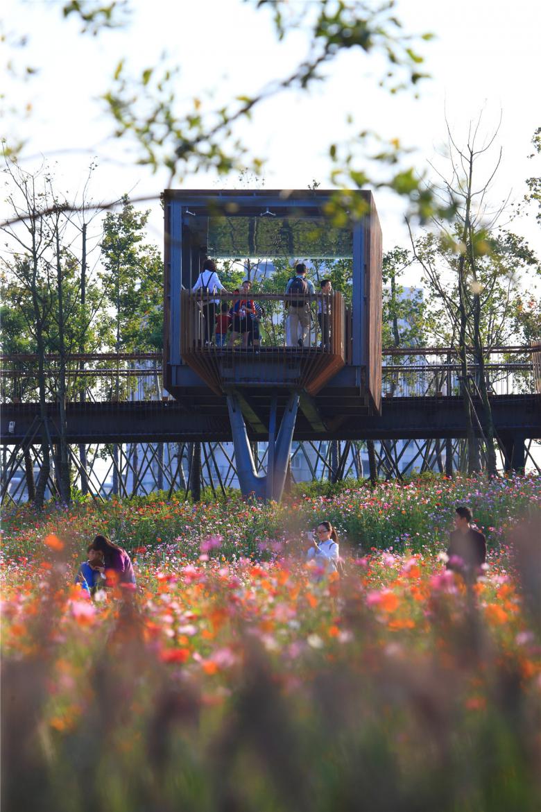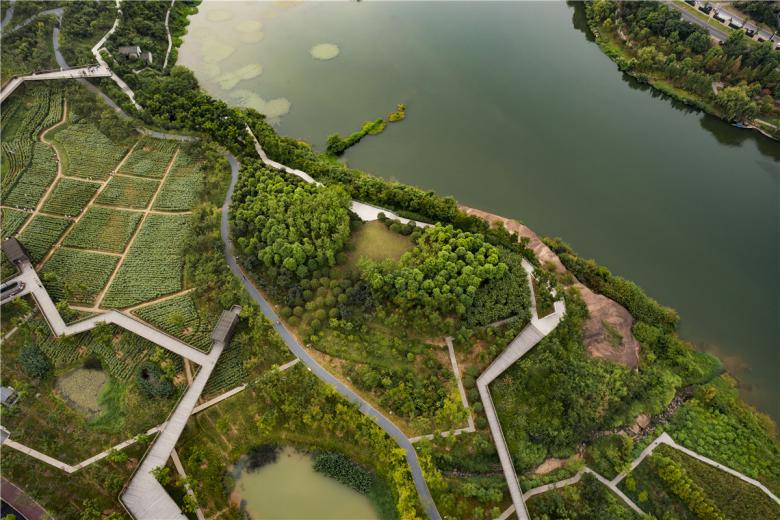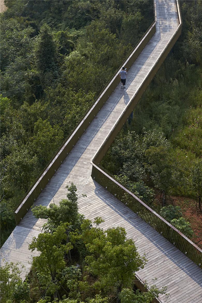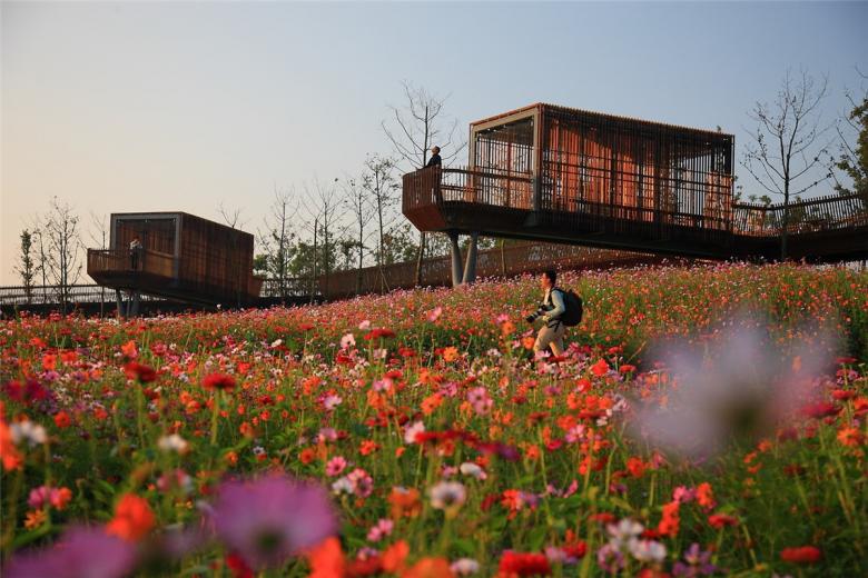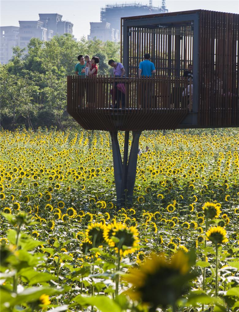The park has been very successful as a place for local residents to relax and recreate. It has become a dynamic urban oasis with celebrations and many kinds of events–like the spontaneous gatherings spawned by social media for locals who follow the seasonal blooming of flowers. These events encourage residents to be aware of the changes of seasons that are often obscured by the hustle of urban life. This connection to nature can refresh the memories of a once rural population (80% of the urban residents, as with the general Chinese urban population, were farmers two or three decades ago). On a fine day, one can be easily moved by scenes throughout the park: kids of various ages jumping and yelling in excitement in one of the pavilions floating above the lush vegetation, young people hugging and falling in love in a fields of flowers, newlyweds having their wedding photographs taken with the productive farmland in the background, couples caring for their babies in strollers above the boardwalk, and elderly couples walking arm-in-arm and resting on the platforms overlooking the new city. As the terrain slopes up from the river, the landscape is quilted with productive and fecund vegetation. Offering respite from the dense urban surroundings, these verdant tableaus are framed by an experiential network of boardwalks and structures that look out onto the memories of the past and hopes and dreams for the future.