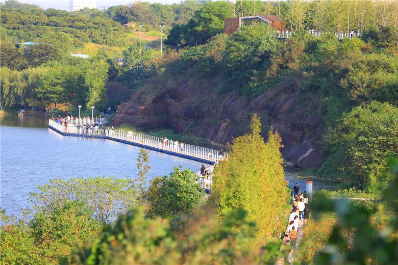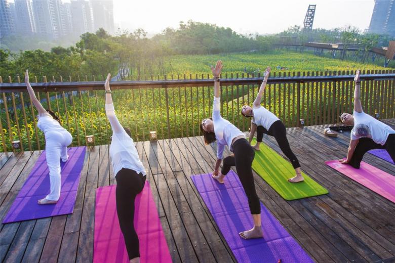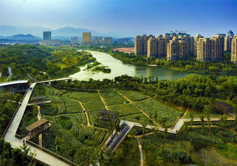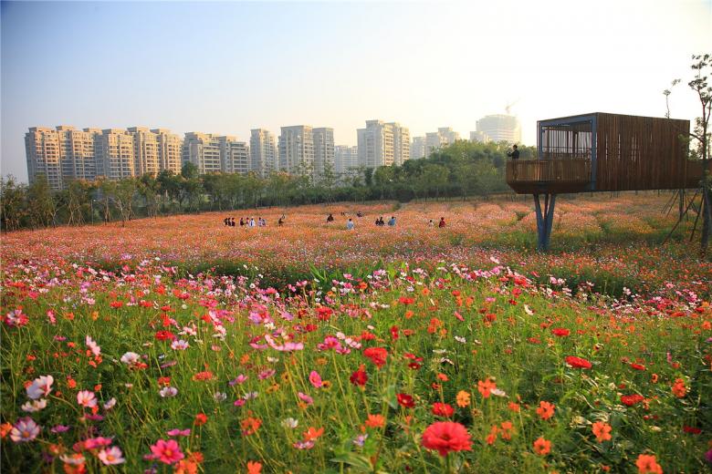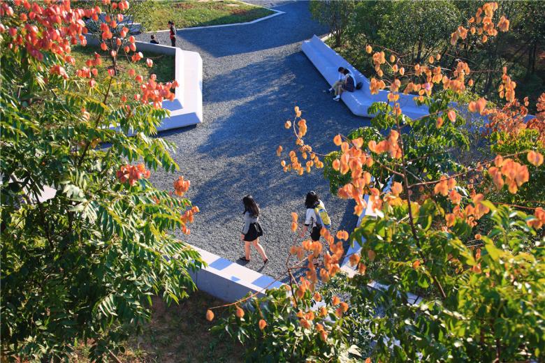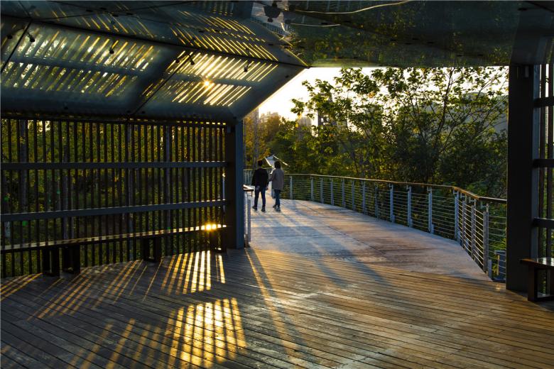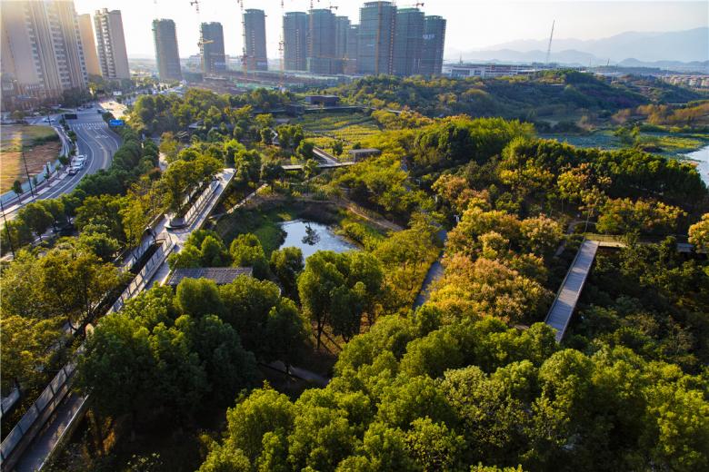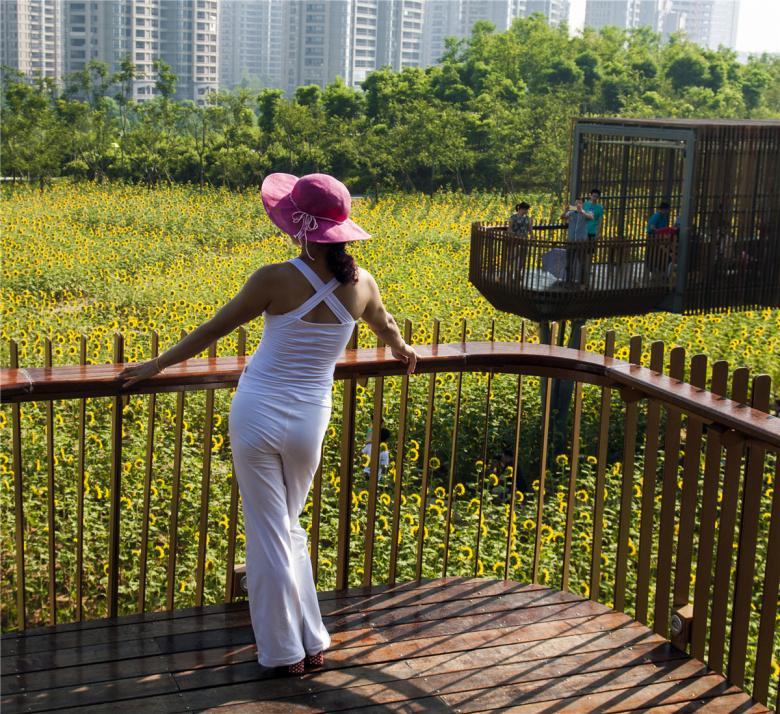 The park has been very successful as a place for local residents to relax and recreate. It has become a dynamic urban oasis with celebrations and many kinds of events–like the spontaneous gatherings spawned by social media for locals who follow the seasonal blooming of flowers. These events encourage residents to be aware of the changes of seasons that are often obscured by the hustle of urban life. This connection to nature can refresh the memories of a once rural population (80% of the urban residents, as with the general Chinese urban population, were farmers two or three decades ago). On a fine day, one can be easily moved by scenes throughout the park: kids of various ages jumping and yelling in excitement in one of the pavilions floating above the lush vegetation, young people hugging and falling in love in a fields of flowers, newlyweds having their wedding photographs taken with the productive farmland in the background, couples caring for their babies in strollers above the boardwalk, and elderly couples walking arm-in-arm and resting on the platforms overlooking the new city. As the terrain slopes up from the river, the landscape is quilted with productive and fecund vegetation. Offering respite from the dense urban surroundings, these verdant tableaus are framed by an experiential network of boardwalks and structures that look out onto the memories of the past and hopes and dreams for the future.