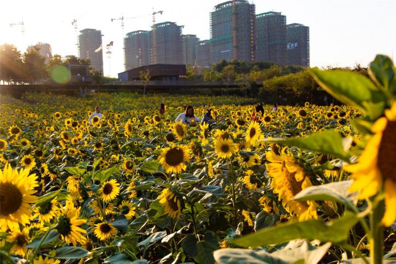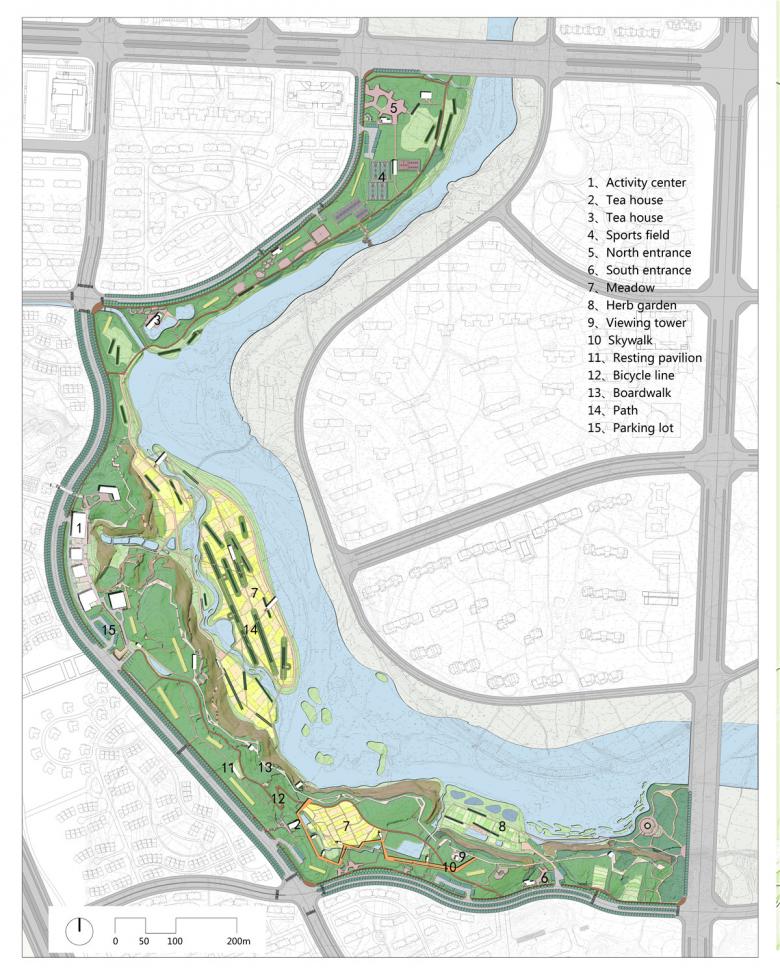 (2) “Quilting” productive vegetation into the terrain: While the existing habitats were preserved, productive crops were introduced to cover the abandoned fields. The crops rotate annually according to the season: canola flowers in the spring, sunflowers in the summer and fall, and buckwheat in early winter. Meadows planted with a mixture of flower species also rotate with other productive crops in some areas. Patches of low maintenance perennial chrysanthemum flowers, which can be harvested for Chinese herbal medicine, are grown to enrich the landscape spectrum. Two areas of grassy lawns are designated for camping, athletic fields, kid’s recreation, etc. The diverse pallet of vegetation creates an overall productive and/or low maintenance canvas that encourages dynamic year-round events and celebrations and provides day-to-day use of the park.