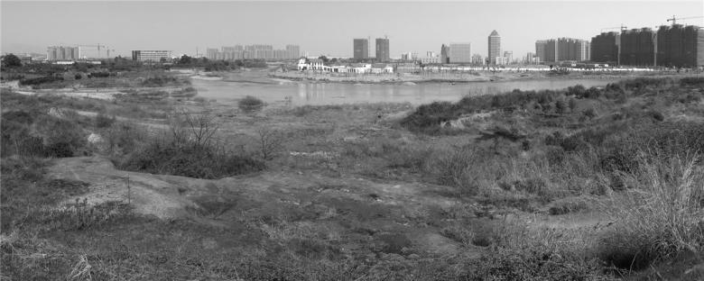 With a total area of 32 hectares, the site is surrounded by intensive urban development, bounded by the river on the west and an urban thoroughfare at the east. It is a remnant patchwork landscape made up of rolling hills covered with a mosaic of exposed red sandstone; vegetated areas of bushes and grasses; small swathes of abandoned farm fields; a riparian flood plain along the river basin; and a linear grove of trees bordering the river. Scattered in this landscape were small village trails paved with river stones, an old resting pavilion, an irrigation ditch leading to a pump house that pulled water from the river. There is an elevation drop of 20 meters from the urban roadway to the riparian flood plain and a sandstone cliff at the water front. The conventional approach in developing a large new urban district in China is to level the site–the method used in the surrounding landscape for urban areas and parks. Simply because this rugged landscape mosaic is not considered valuable or aesthetically pleasing and the cultural landscape elements are deemed insignificant, the common practice of leveling the ground simplifies the mechanical and engineering processes and facilitates the installation of infrastructure such as roads, water supply and storm water drainage.