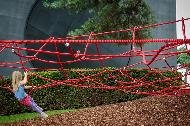 Climbing net designed by Corocord and the Danish playground manufacturer Kompan. Located between the Lamborghini and Škoda pavillions in Autostadt, it harnesses both the shade and strength of pine trees, making it a favorite play space for kids of all ages.