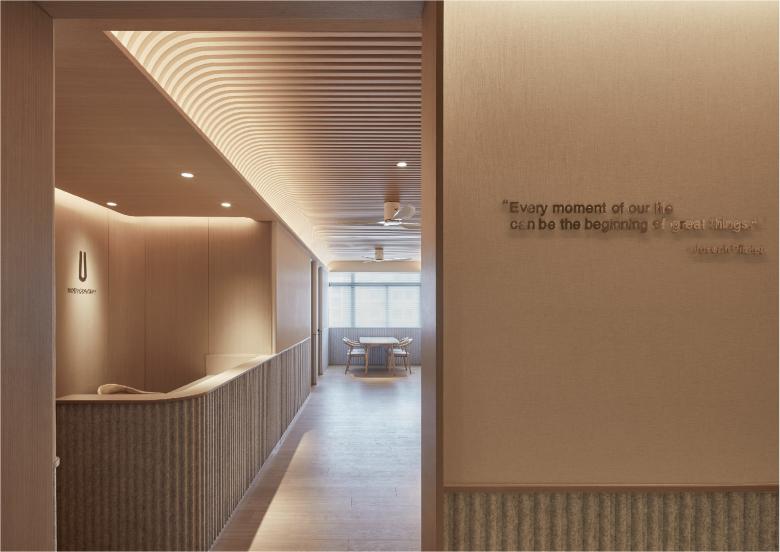 The second stage to switch the mood is in the training area, where bright natural light comes from the large windows. Light filtering through the rolling curtain, with the reflection of the large-scale mirror, and touch on the wooden finishes, give the entire training area a gentle and relaxing feel.