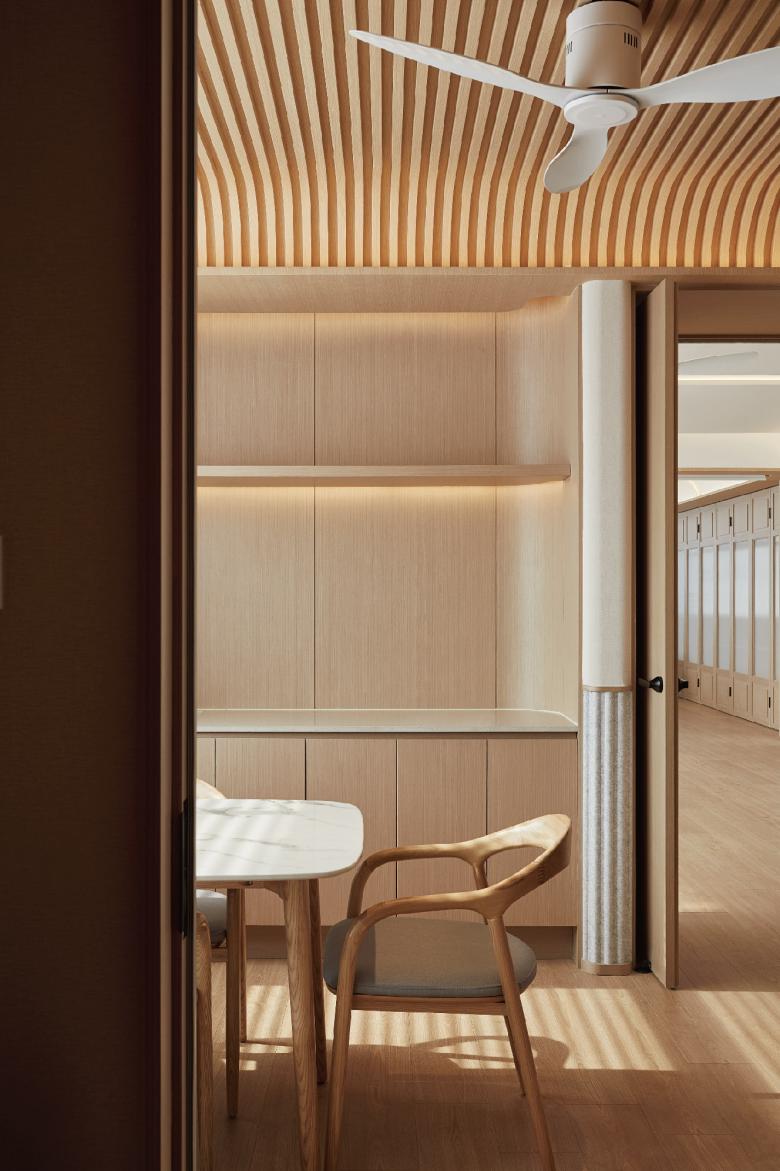 The training area is flexible by using partition and curtain, providing a sense of privacy when needed, and also give the space an airy feel