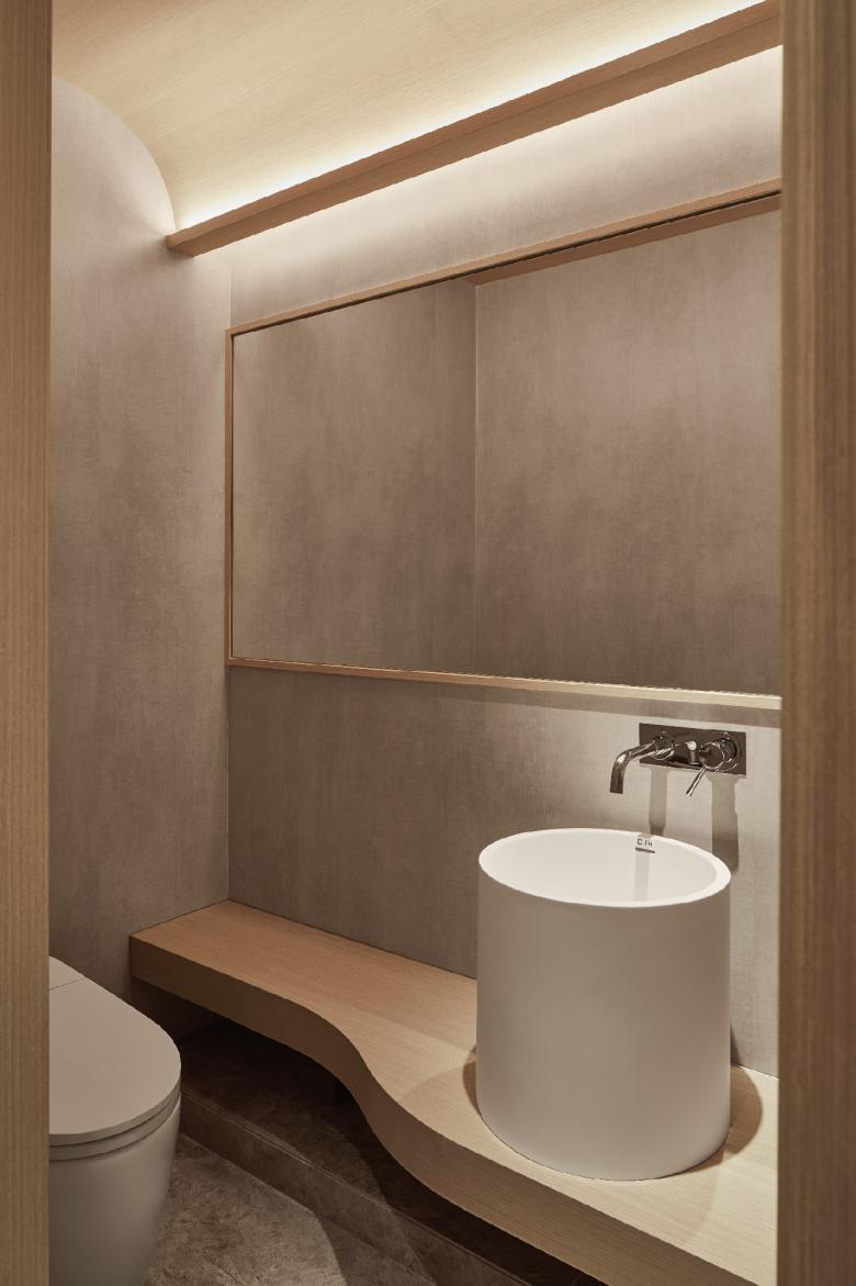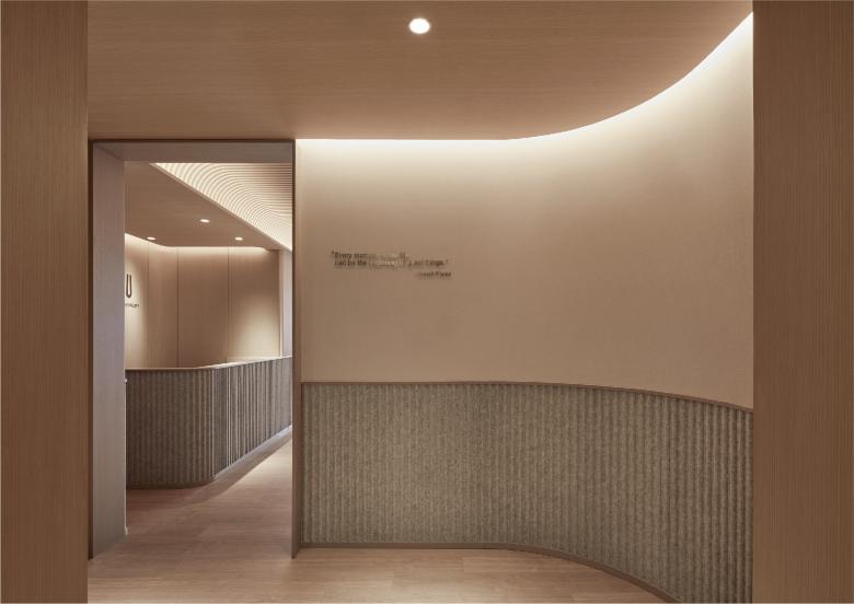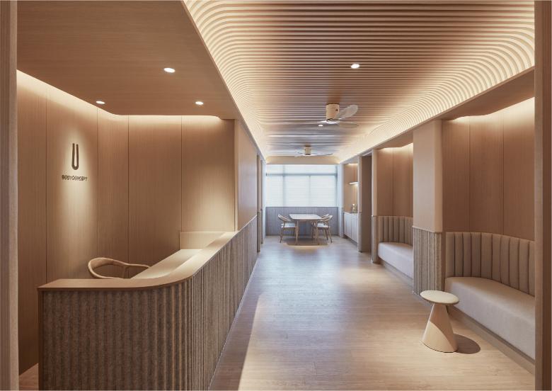 At the entrance, we lead members to the reception area through a large 1/4 rounded corner, just like how Da Vinci presents the golden ratio of the human anatomy between the rectangle and circle in "Uomo Vitruvian". This gives the first impression that the body is prepared to be stretched, then a large number of curved wood veneers in the space brings a warm and safe sensation.