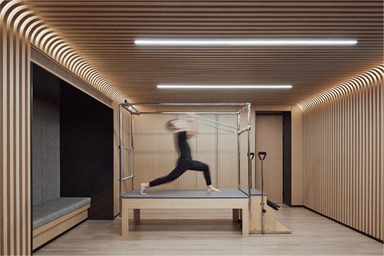 Pilates is an exercise focused on muscle control, which emphasizes the concentrated, core, and precise training of muscle management and breathing. In addition to the high concentration required to students, the controllability of the external environment is also an important factor that can help the trainees enter the state. The concept of this design is introverted and rational. Besides paying attention to the user's comfort, the controllable environmental factors in the training process are the highlight.