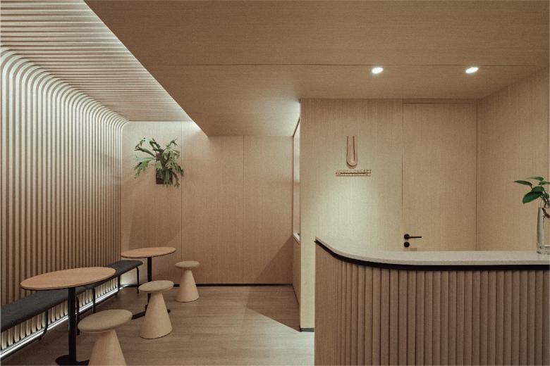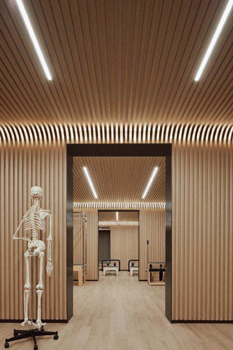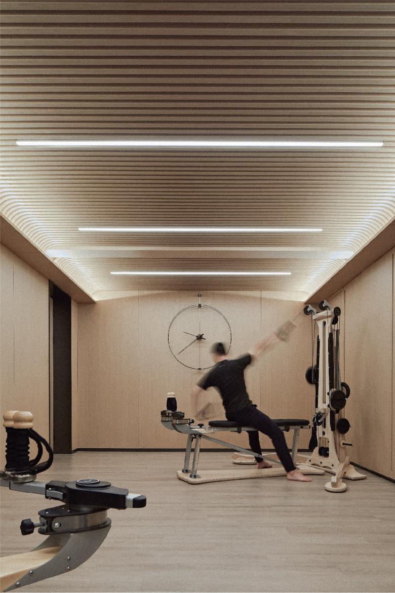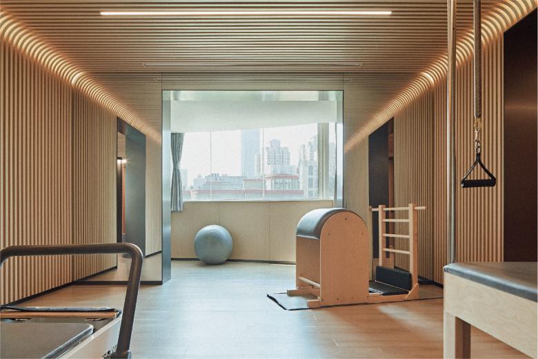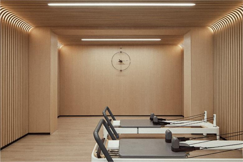 Follow the essentials of the exercise, facades are made of wood, and the part of the shape keeps the arc, which minimizes the visual stimulation. There are many laydown postures in Pilates, so lighting design avoids the form of direct illumination to ensure the smoothness of the training process.