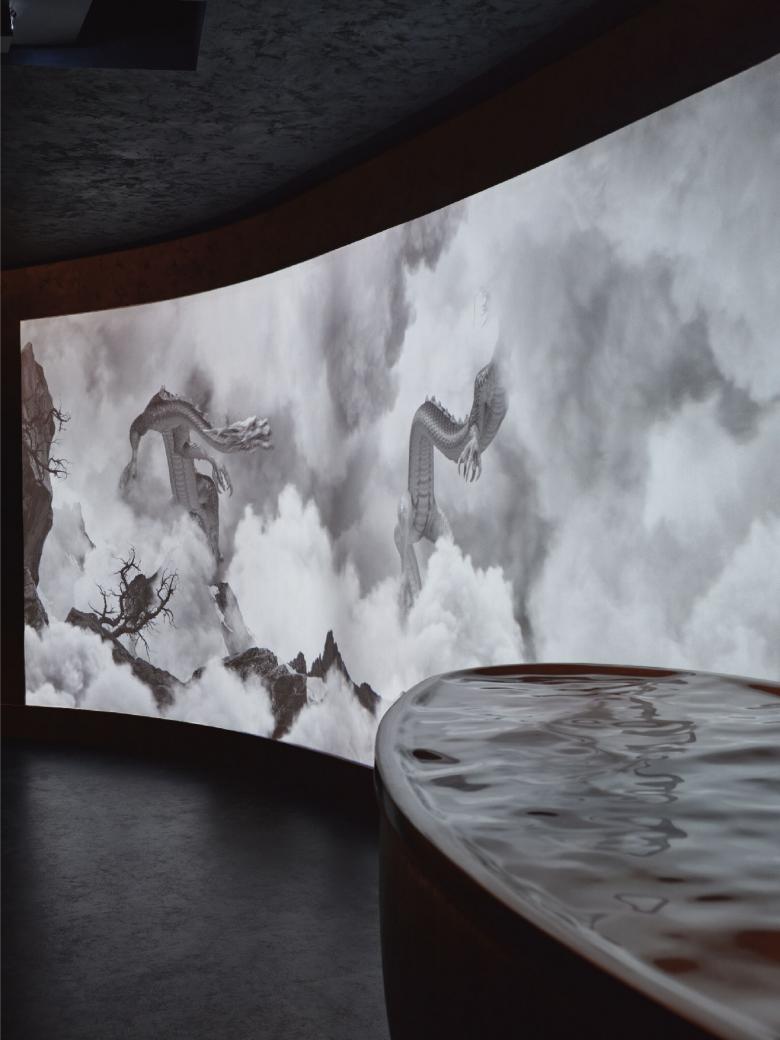 The multimedia artwork “Chasing Cloud” by artist Yong Yang Liang, creating another fantasy world with two Chinese dragons flying through the mist and clouds. In terms of Eastern cultures, the black color represents both mystery and dignity, and the yin-yang principle from Tai Chi implies the circle of life.