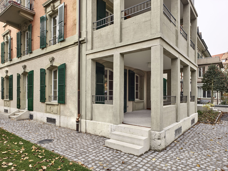 Die nordseitige Erdgeschossfassade wurde rekonstruiert und in beeindruckender handwerklicher Präzision wiederhergestellt. Einzelne Bauteile aus dem Lager der Denkmalpflege vervollständigen das Gebäude in seiner historischen Erscheinung. In Analogie an die ursprüngliche Verandaterrasse entstand auf den Grundmauern des erhaltenen Natursteinsockels eine zweigeschossige Veranda in Sichtbeton. Stützen, Träger und Füllungen sind differenziert zueinander versetzt und vor Ort vergossen. Die Farbigkeit und Oberflächenstruktur stellt eine leise Referenz an die vorgefundenen Sandsteinelemente des Gebäudes dar.