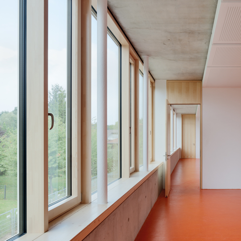 Der zweigeschossige Kopfbau im Westen, in welchem die gemeinschaftlichen Nutzungen angeordnet sind, markiert den Haupteingang. Über den erdgeschossigen, teppichartig organisierten Klassenbereich, welcher kindgerecht kleinmaßstäblich an den Kopfbau anschließt, gelangen die Schüler zum geschützten, im rückwärtigen Bereich gelegenen Schulhof. Jedem Klassenraum ist ein Klassengarten zugeordnet, der von der jeweiligen Klasse gepflegt und bepflanzt werden kann.