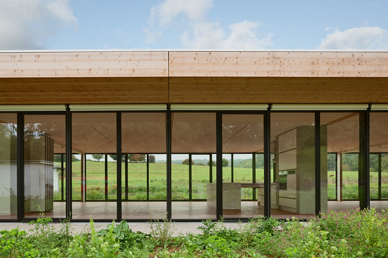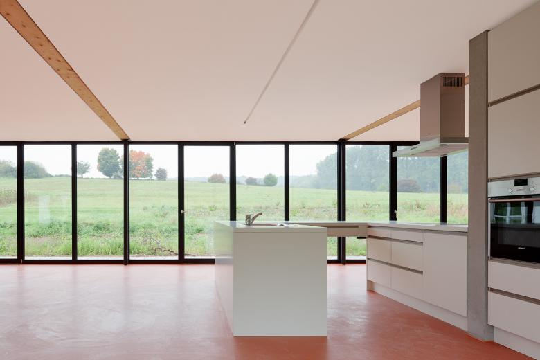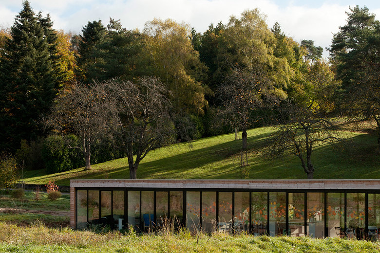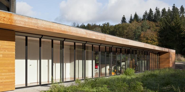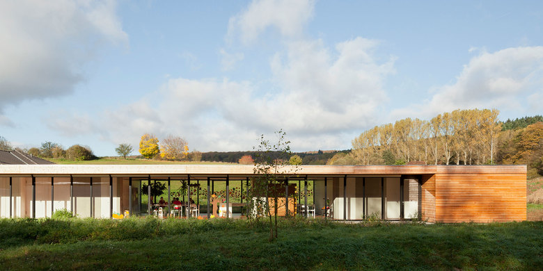 'Beschützend' überspannt ein langgezogenes Dach den offenen Grundriss der Fördereinrichtung zur aktivierenden Tagespflege für die Betreuung von Erwachsenen mit geistigen und teilweise körperlichen Behinderungen als Erweiterung des bestehenden L-förmigen Wohnhauses. Pavillonartig fügt sich der Anbau in den reizvollen Landschaftsraum ein. Das Gebäude lebt von seiner Transparenz zwischen Innen und Außen, Durchblicken und Ausblicken in die Landschaft. Ein reduziertes Material- und Farbkonzept prägt die behagliche Atmosphäre im Inneren.
