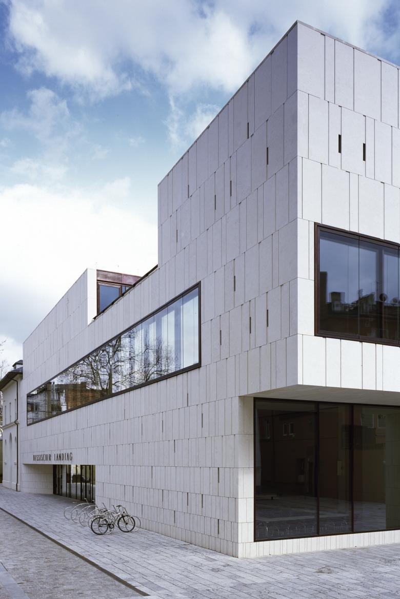 ’Der Neubau des Plenarsaalgebäudes des Hessischen Landtages besticht durch die Einfachheit seiner Großform. Es gelingt ihm, seine Umgebung neu zu ordnen und wie nebenbei mit seinen Kanten klare Stadträume zu definieren. Auf den städtebaulichen, in seiner Maßstäblichkeit überaus heterogenen Kontext mit einer sehr plastischen Gestaltung des Baukörpers zu reagieren, erweist sich als äußerst wirkungsvoll. Der Dialog mit der vorhandenen historischen Bebauung, der aus einem Verständnis einer zeitgemäßen, modernen Architektursprache geführt wird, trägt zum überzeugenden Gesamteindruck bei.’