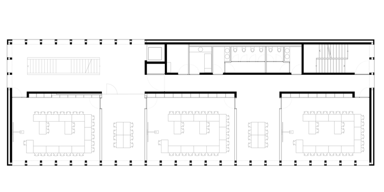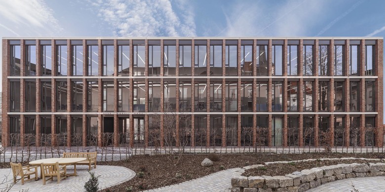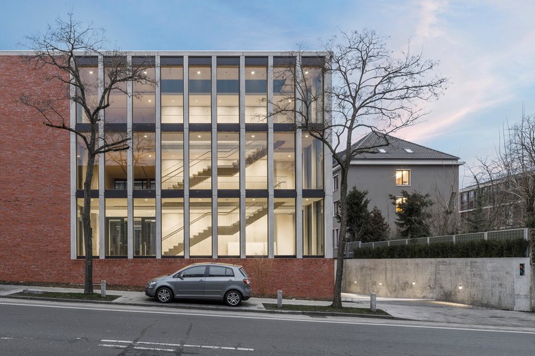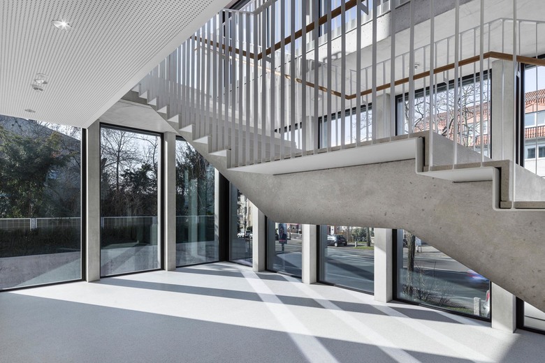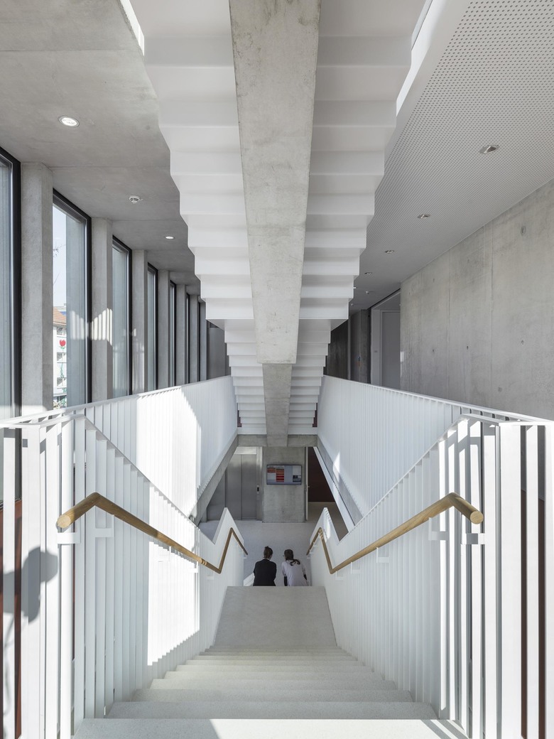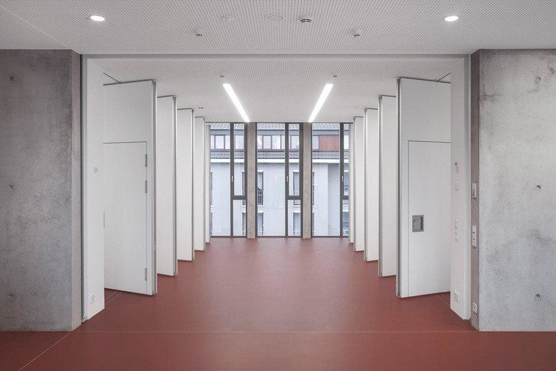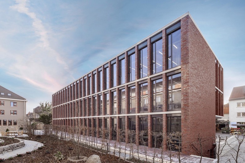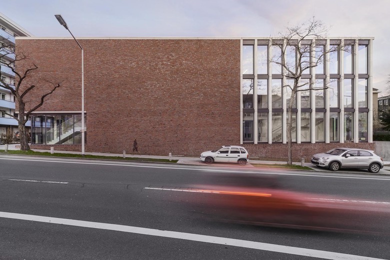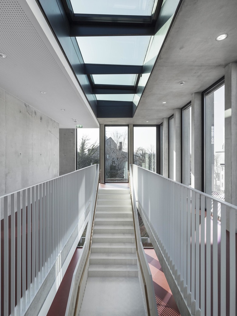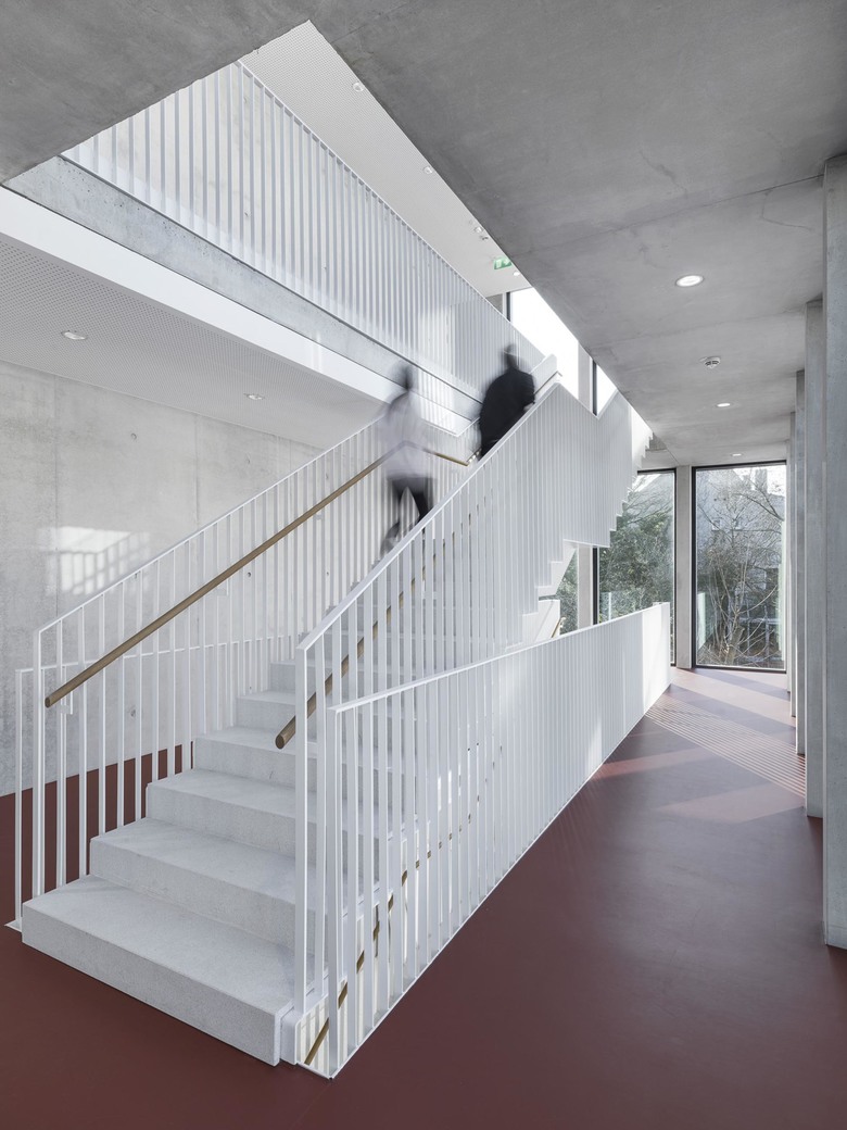 Der Neubau des dreigeschossigen Schul- und Weiterbildungsgebäudes nimmt als Riegel die nachbarlichen Baufluchten auf und schließt den Blockrand zur Pützerstraße. Durch die großzügige Geste einer mehrgeschossigen Glasfassade an der Südwestecke öffnet sich der Baukörper einladend zum Straßenraum. Mit seiner Ziegelfassade und den Fensterelementen in Holzbauweise erhält der Baukörper einen warmen und freundlichen Charakter und fügt sich so gut in das nachbarschaftliche Wohnumfeld ein.