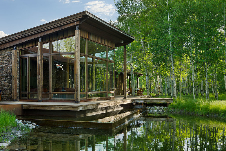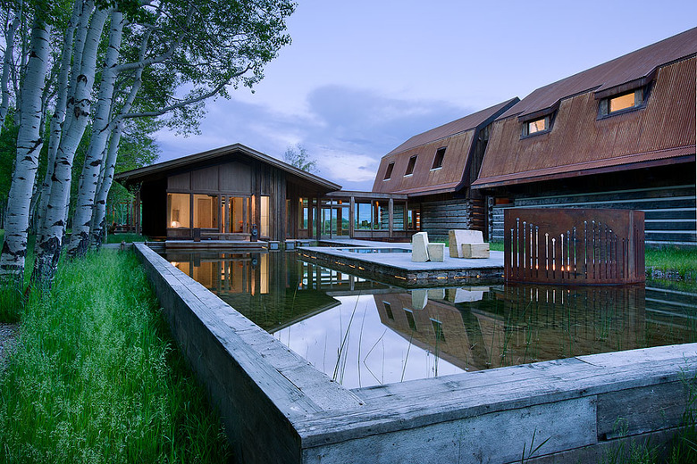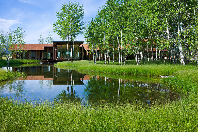 This residence is sited in a natural clearing in a huge grove of aspen trees on a low lying lot situated between the Teton Range and the Snake River in northwestern Wyoming. As the site is dominated by jurisdictional wetlands; natural water courses and man-made water features figure prominently in the site design.
