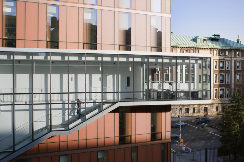 Located on Broadway, the multi-use arts center unites landscape and architecture, interior and exterior in a seven-story building with ascending double-height glass atria and an unfolded glazed staircase that bring in natural light and eliminate visual boundaries between the College and the city. Carving a diagonal void through the building, the slipped atria create views through diverse program spaces and visually connect Lehman Lawn to the upper floors of the building and the green roof. The facade - composed of 1,154 clear and color integral glass panels - translates the brick and terra cotta of the surrounding neighborhood into a luminous, energy-efficient exterior.