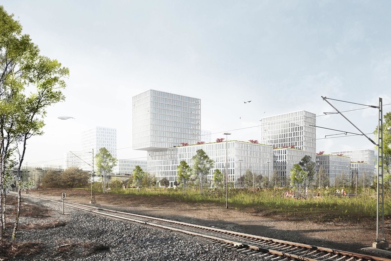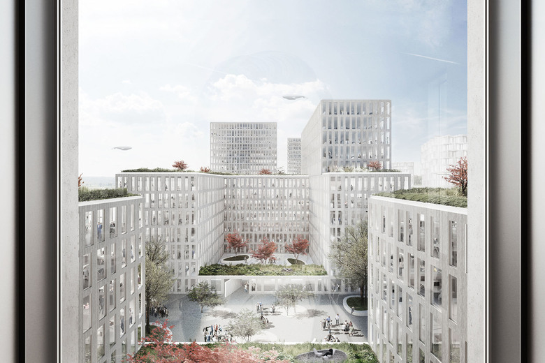 All of the parking garages are submerged, and two of the four buildings are connected underground via one of these garages, which increase the access, and sharing of utilities, between these four buildings. The project’s façade is to be comprised of concrete panels, with an ornamental surface-texture relief, which is anticipated to allow the entire project to subtly mirror the tactile qualities of its immediate environment. Various sized floor-to-ceiling windows, some of which are operable, and some of which are fixed, further contribute to the high degree of interior flexibility. Glazing occupies half of the façade surface area, protected from solar gain by a computer-controlled algorithm, which can also be overridden by office employees, for added comfort. From the office interiors, inhabitants either look outward to Munich, or inward toward the semi-private courtyards–a view that entails overlooking multiple lusciously sprawling gardens, which will take root atop the roof of each plinth.