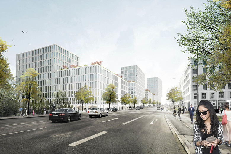 Located on the western edge of Munich, near the Friedenheimer bridge, and adjacent to the light-rail lines that string throughout the city’s center, ‘Am Hirschgarten’ is a campus-like cluster of four buildings, each of which entails a tower, which rises from the base of every building’s plinth. The project’s urban planning requirements mandated economical, sustainable, and flexible buildings, whose programming could also accommodate a future conversion–for instance–into residential spaces. ‘Am Hirschgarten’ therefore constitutes four horseshoe-shaped buildings, each with a plinth of six to seven stories. A tower rises from each plinth–the pinnacle of which is 17-stories; it prominently cantilevers from its plinth, which creates a landmark within the project. Only steps away from the ‘Hirschgarten’ station along the city’s light-rail lines, and just a few hundred meters from multiple stops along the city’s tram lines, this campus-like cluster of four buildings is able to be swiftly accessed, throughout the entire city.