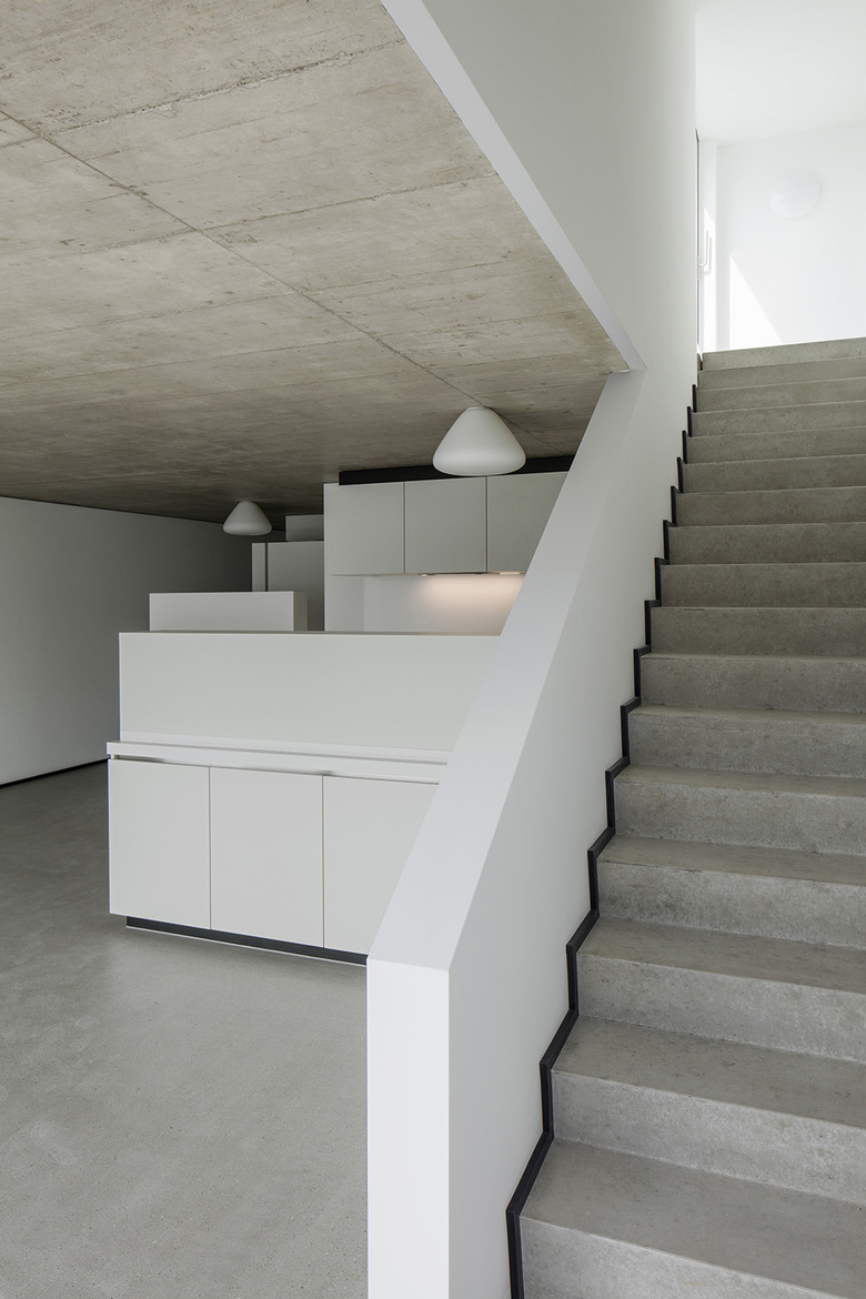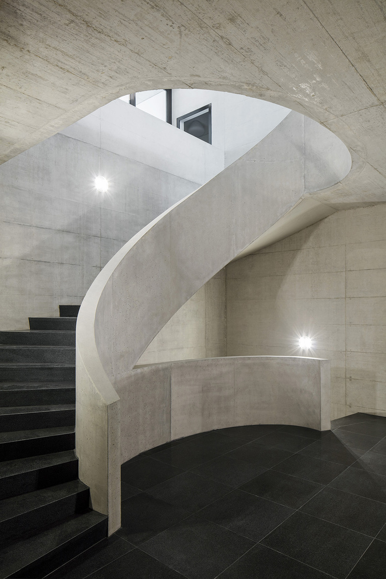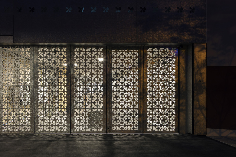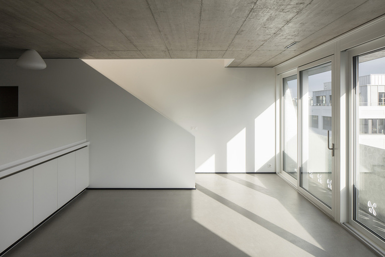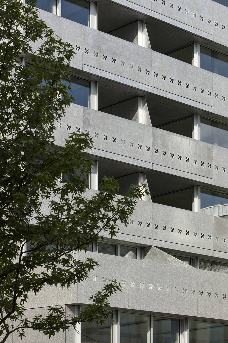 Blumenhaus’ ground floor façade is free on three sides, which maximizes street-facing frontage, and ensures the ground and first floors remain flexible. The west façade abuts an adjacent housing building, at an acute angle, which enabled the creation of the parking garage entry along the northern façade; it slightly curves as it descends, allowing the inversely curved space at ground floor, to function as the residents’ entry point. Accordioned matte-aluminum panels, ‘punched’ with the same hibiscus flower silhouette at high density, enable physical security for the building’s inhabitants, by acting as a gate, while allowing visual permeability. Numerous cloverleaf columns are to be found throughout the interior, echoing exterior ornament; a spiraling concrete staircase swirls from the parking garage to the first floor. The top five floors contain 23 units, all rental apartments oriented in at least two directions–each with a north-south orientation, or an exposed corner–with most having access to natural light along the southern façade. Loggias wrap the Blumenhaus’ three free façades, which function as balconies. Four units of the top floor have staircases that lead to individual, generously sized private roof terraces; floor to ceiling glazing and oversized opening elements prelude exterior spaces, thus enabling 'loggia living'.