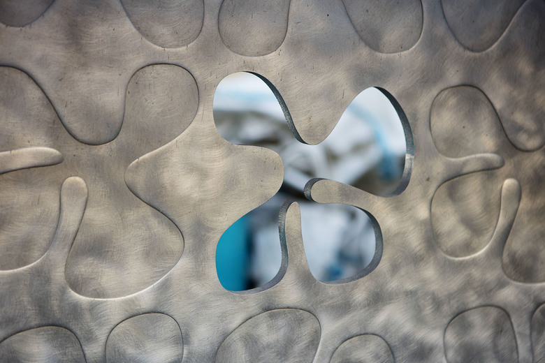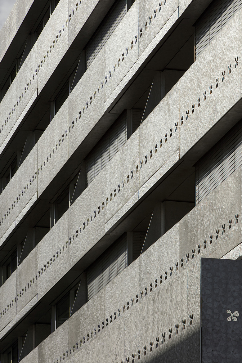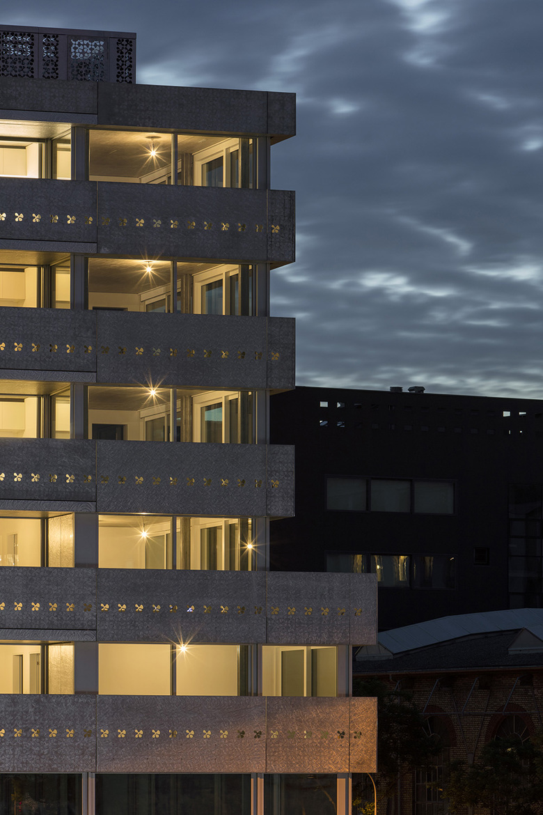 When Escher-Wyss is juxtaposed against the city center–which abuts Lake Zurich–industrial relics dominate; yet it is intertwined with the center, by the Hardbrücke railway station, in tandem with numerous trams. Stealthily slipping into this ‘rough’ yet regenerating urban context, Blumenhaus' façade is finished with enormous matte-aluminum panels, nearly each of which is punctuated by the silhouettes of hibiscus flowers, and inversely, reliefs of the same patterning. These custom-designed, and ornament infused panels were crafted through an industrial process of ‘stamping’ the patterning through, or imprinting it onto, the aluminum, by sheet-forming and cutting; a process that involved metal-workers. The panels’ matte finish–and hibiscus flower silhouettes–lessens the lust of their shine, which allows their scale to recede when seen from afar, or at street-level. As the building ages, the oxidation process will add a weathered appearance to its exposed façades, allowing it to ‘age’ along with the area’s already ‘aging’ relics. Blumenhaus' materiality, thus acknowledges its context’s storied industrial past, yet its incorporation of technology is readily apparent, only upon second-glance.