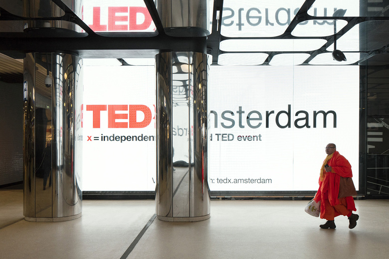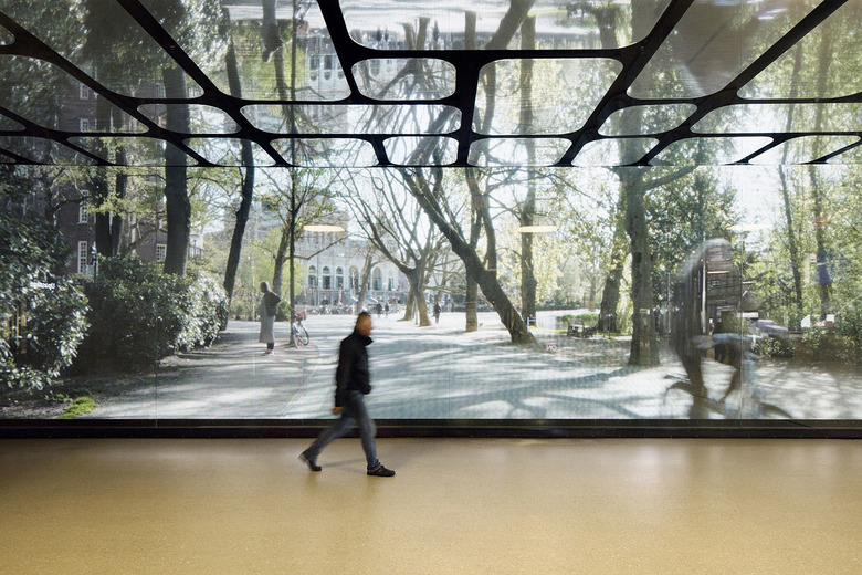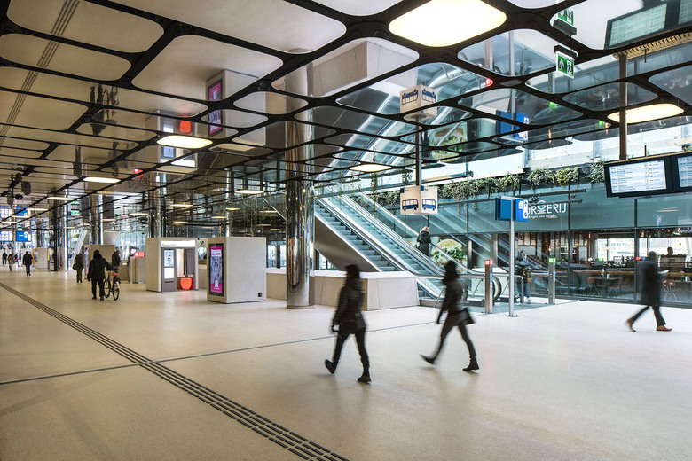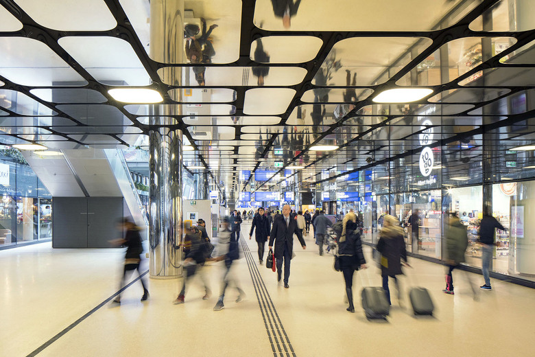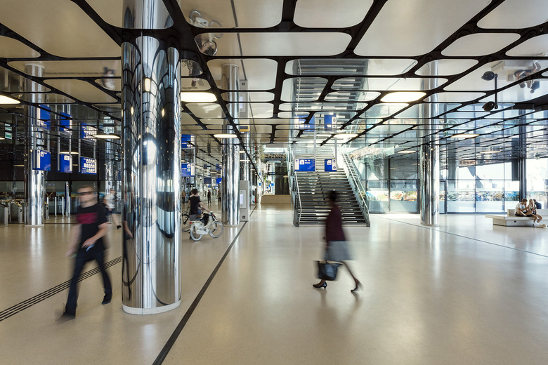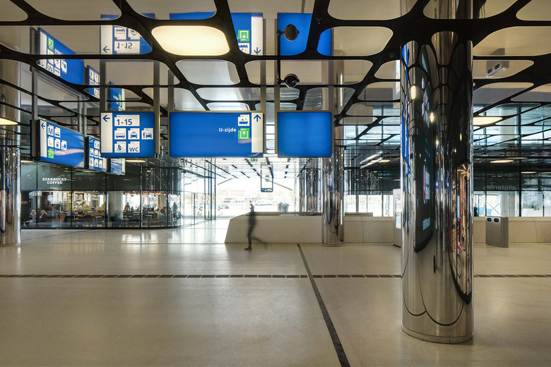 Outfit with enormous LED screens, which continually transition their displays between voyeuristic, calming scenes of the city–and alternatively, advertising–and set with a golden-yellow-tan hued terrazzo floor; the multifaceted interior passage is meant to encourage constant pedestrian movement, simultaneously remaining durable under the foot traffic of tens of thousands of travelers each day. A system of modular, rounded mirrored elements adorns the IJhal’s ceiling, arranged in a playful grid that introduces a sense of movement to the ever-shifting reflections from below, communicating in tandem with the mirrors that wrap the passage’s load bearing poles, which dot the IJhal’s main axis. All of these mirrored elements cast the radiating, ever-undulating fluctuations of the IJ's surface reflections in the IJhal so they refract into the adjacent passageways, in a nod to Amsterdam’s, historic, deeply intertwined relationship to water.