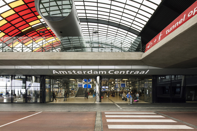 Terrazzo, in addition to its use on the IJhal’s floor, was also chosen for the custom way-finding signage holders, and the many photo-booths that align the IJhal’s main pedestrian axis, enabling a visually cohesive language to emerge. Simultaneously, the signage of each shop and restaurant has been integrated into the walls of glass that front all such ‘interior’ spaces in the IJhal, with each lit from behind, further brining unity to this otherwise frantically busy location within the station. A series of secondary passageways perpendicular to the IJhal impart direct visual connections to the waterfront, throughout the entire station. Notions of transparency and reflection within the IJhal, seek to reestablish Amsterdam’s connection to its northern neighborhoods, which were severed from the city’s center, upon the train station's completion, in 1889.
