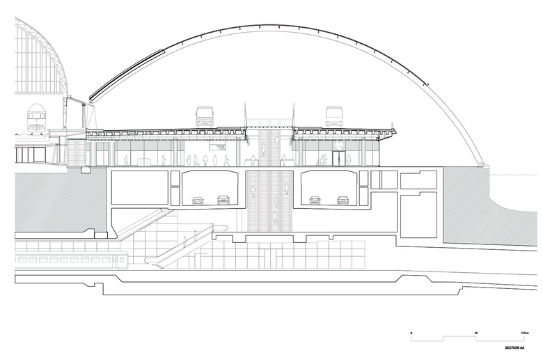 Shops align the IJhal’s southern edge, while strung along its northern is a series of restaurants; the latter’s situation within the project, along its water side, enables views toward the water of the IJ while dining, and the observation of a constant stream of cyclists passing by, on the new bike ‘highway’ that runs parallel to the river IJ. Staircases within rectangular voids connect the IJhal to the regional bus terminal above, with waves of winter-hearty, undulating ivy gardens, whose growth spills over and into the voids from above–introducing a gentle, natural element, within this highly chiseled, and otherwise extremely durable area, which must daily accommodate tens of thousands of travelers. Escalators below every bus staircase will eventually lead to the train station’s metro stop, and platforms for the North-South line, which runs under the station, perpendicular to the IJ; this metro will eventually the city’s visitors and residents to bypass its tram system and instead use this metro, if venturing south of the station toward the city.