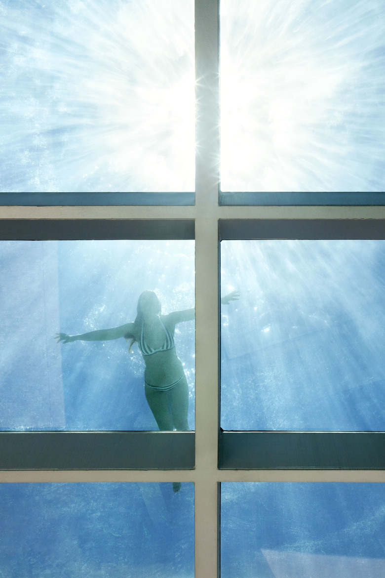 The house’s rooftop pool is cantilevered 9 m southwest–toward the Sierra Blanca mountain range in the distance–and weighs nearly 60,000 kg. Equipped with an infinity-edge, its water merges with the sea in the distance. This pool has a glass-bottom floor and a panoramic window at its interior facing edge, both of which are 6 cm thick; the latter allows those in the kitchen to voyeuristically view those swimming, while a third window affords those in the kitchen a glimpse of the living room, whose terrace extends under the cantilevered pool. The searing Spanish sun constantly filters through the pool’s glass wall and floor, creating ripples of iridescent turquoise reflections throughout the entire house. As such, the pool can be seen and experienced from nearly all areas of the house. Integrated within the pool is an underwater bench, which traces its length and also integrates a pool cover, so that it is out of sight when the pool is in use.