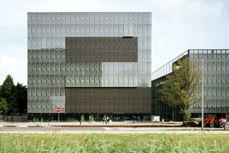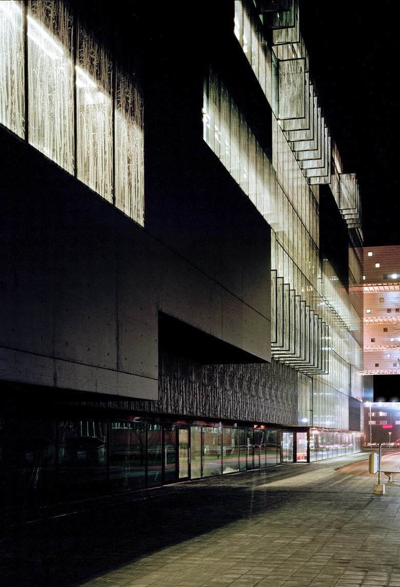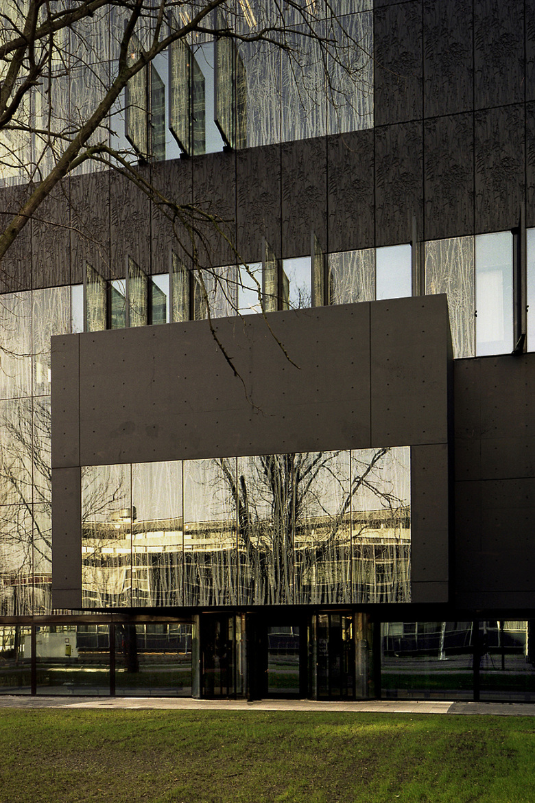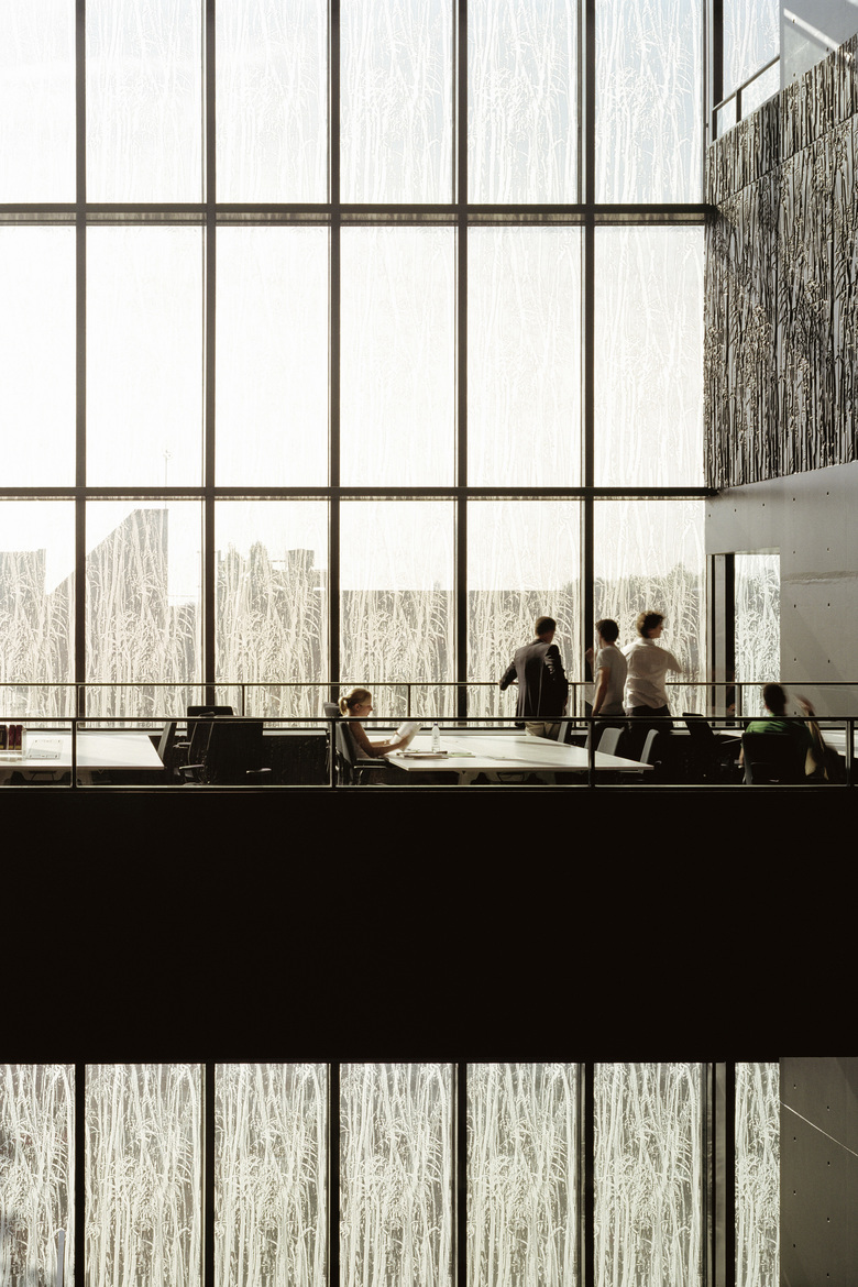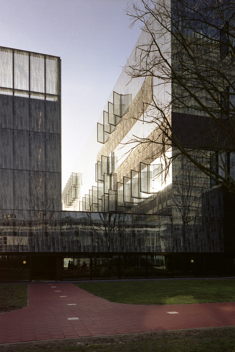 The Utrecht University Library, established in 1636, is located on the Uithof campus, situated a short distance from the city center. It is comprised of the library itself and an adjacent parking garage with multiple voids–between which is a courtyard garden and a café named for Johannes Gutenberg–and the fenestration of both is fritted with an abstracted image of fossilized papyrus. The relief of this image is imprinted on concrete panels, which are equal in size to the fritted glass panels; together they compose the building’s façade, and the concrete panels return within the interior.