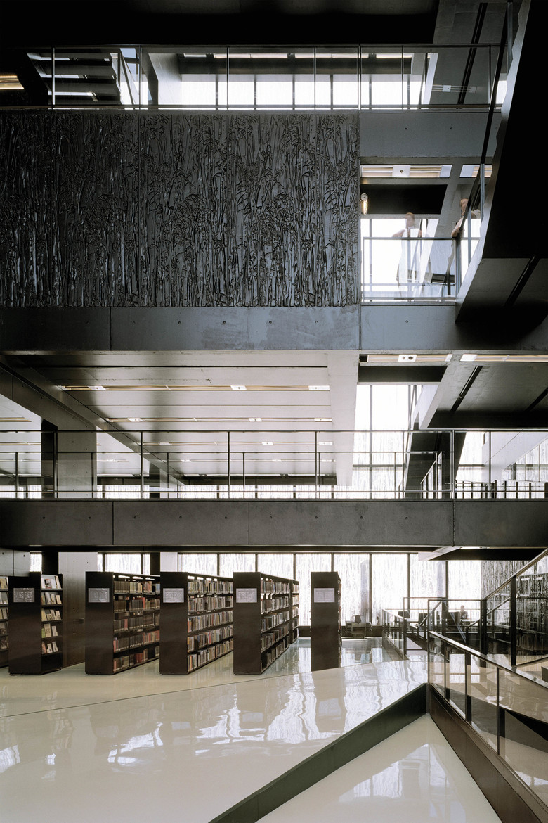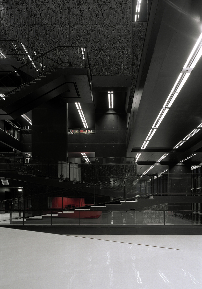 Where the library’s black concrete surfaces are imprinted with the papyrus relief, book stacks are to be found behind, as the library does not have one central book depot, and instead utilizes multiple stacks dispersed throughout each level, which seem to float like black storm clouds throughout the main space. When totaled, these stacks house more than 4.2 million books. The omnipresent color black is critical to creating the interior’s transcending atmosphere of concentration, security, and silent communication–all of which are essential to the integrated functioning of this distinctively refined university library.
