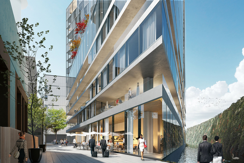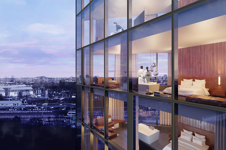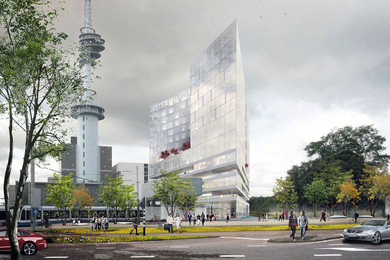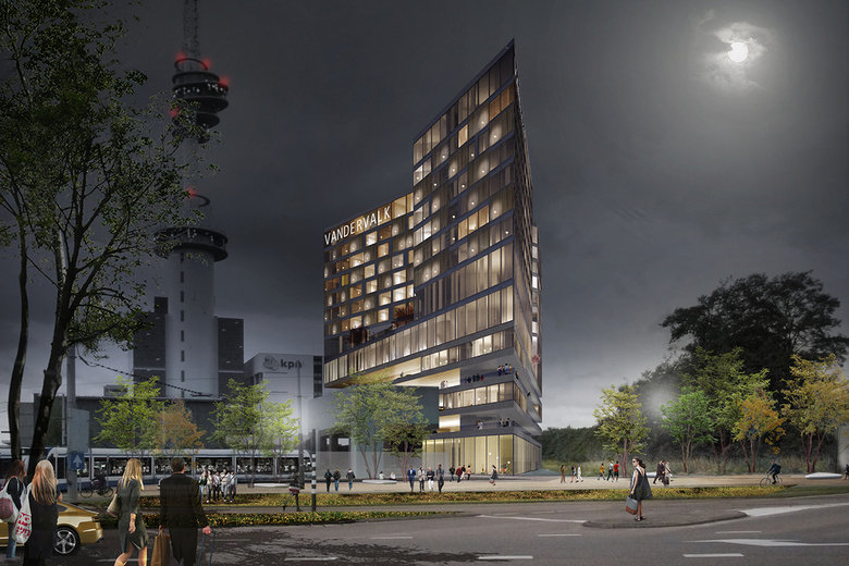 With origins as a highway-centric motel chain for travelers by automobile; Van der Valk is an international company, whose roots are Dutch, and whose hotels are almost always sited adjacent to highways, providing standard lodging and dining for those traveling long distances by car. Seeking to reposition itself in the Dutch market, while spurring a renewal of its image; the chain, long known for its hotels sited in-between major Dutch cities, will add a new location to their portfolio of properties, with a 26.000 m2 hotel in Amsterdam. Situated along the southern edge of the ring highway that encircles the city–the A10–the new hotel encompasses circa 240 rooms, several cafés and restaurants, a meeting center, congress hall, spa and wellness center, and a plethora of terraces offering views out over Amsterdam. Because the hotel is steps away from the city’s convention center–between the business district and ‘Old South’ neighborhood of the city, constructed just before the 1929 Olympic Games–the hotel is connected to the city through numerous bus, metro, and tram lines. The nearby train station, will also allow guests to easily explore the Netherlands, beyond Amsterdam. Standing at a height of 55 m, the hotel has 15 floors, which, in a nod to its storied motel history, positions it in prominent view of those driving on the adjacent highway.