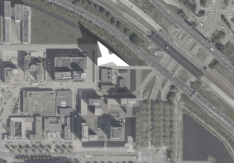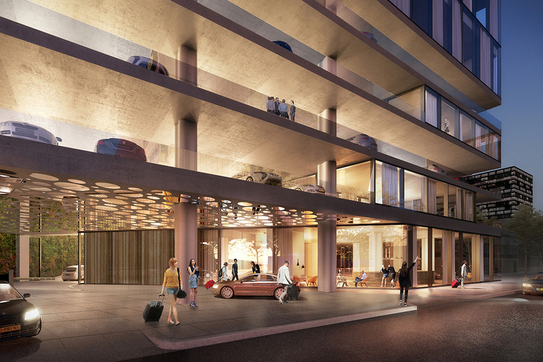 The hotel occupies a long-empty, triangular shaped site, which has informed its volume. The parking garage occupies the first four floors, utilizing the maximum possible floor area and extending to the site’s borders. The ground floor semi-lobby, oppositely, does not extend to the site’s edges, with varying cuts into its façade, which creates covered spaces acting as awnings for guests entering the property. The ground floor has two main entrances that enter onto the same, semi-lobby-like space; one entry is nearer to the nearby tram stop, for those approaching the hotel by foot, whereas the other is at the site’s western edge, which functions as a covered car-drop-off, as for taxis, next to which there is a ramp, inclining to the four story parking garage above. It was chosen to elevate the hotel’s ‘main’ lobby to the fifth level, just higher than the noise-barrier that runs perpendicular to the highway, so that the view from the lobby overlooks the city in all directions, instead of onto the barrier. The barrier itself will be covered with a green wall, with a newly created canal in front of it, therefore functioning as a huge garden, seen from the parking garage and lobby–though not able to be accessed by foot. An enormous, 15x5 m LED screen covers the wall opposite the main automobile entry; ‘closing off’ the area while also activating the space, through the ability to dramatically alter its mood via the imagery on the screen.