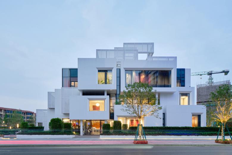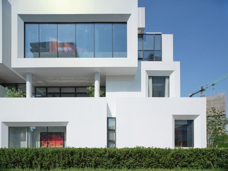 We re-analyzed the programs and circulations of Vanke's sales center and categorized them differently. We merged the core and communal space and defined it as a big "noisy" space that flows through three floors. And the audio-visual hall, sandbox area, office, model room, tearoom, coffee, meeting, negotiation, signing, VIP reception, indoor garden and other rooms are independent as "quiet" small boxed-shape plug-ins attached to the big space according to the flow line in turn. You can recognize these stacked boxes on the façade and see part of the flowing "noise" in the gaps of the boxes.