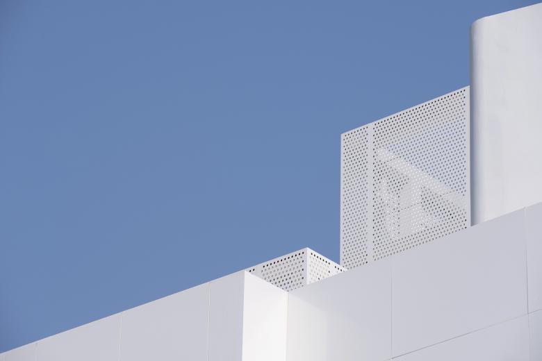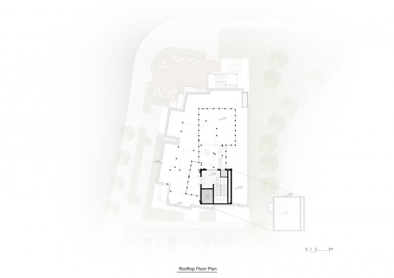 In order to avoid the 3-story height limit that would turn this "mountain" into a flat roof, we continue to use boxes on the roof to form a stepped "mountain" look. Originally, each box was a platform where guests could walk up the steps to the top, where they could look around and appreciate the beauty of the landscape. However, because of the restrictions of the "roofing platform" and "roofing without people" on the height limit, as well as the floor area and strict cost control, the boxes shaping the summit can only be turned into a pavilion. Although it is not possible to pace from the ground to the top of the hill, it is a perfect way to conceal the equipment on the roof.