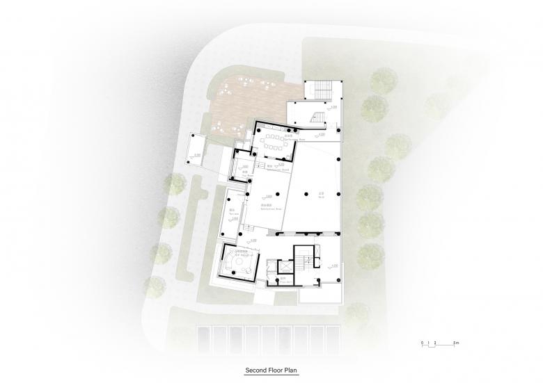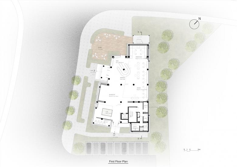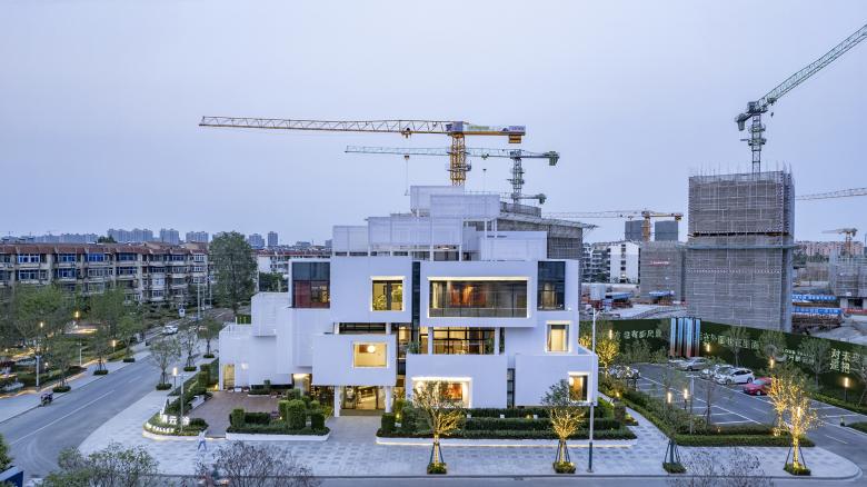 Although the site is a prototype city, the actual buildable land restrictions are very high. After meeting various planning and fire-proof conditions, the narrow trapezoidal building site within the building setback line is about 500 square meters, and the height limit of the structure cannot exceed three floors. The total construction area of the prototype, including two sets of sample houses, is only more than 1000 square meters. This small demonstration area center actually has no extra floor space as a stage for people to perform.