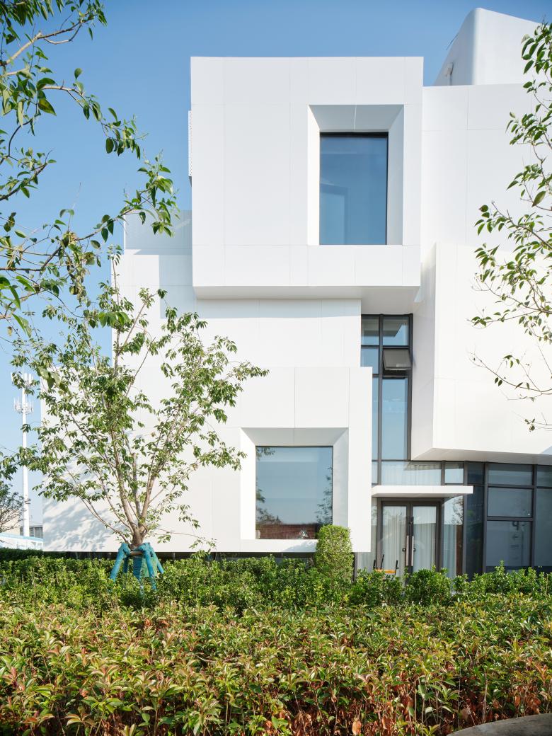 When we were investigating the site, Xia Xia noticed a line of mountains that appeared steeply in the distance of the normally unrecognizable interface. This unexpectedly concrete and natural green mountain became the inspiration of our design, and we piled up an abstract artificial white mountain as the image of Vanke Cloud Valley demonstration area by flowing boxes.