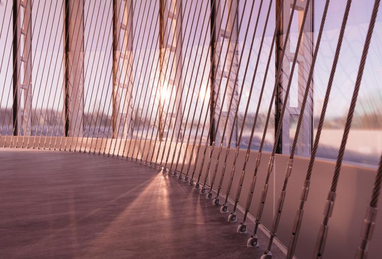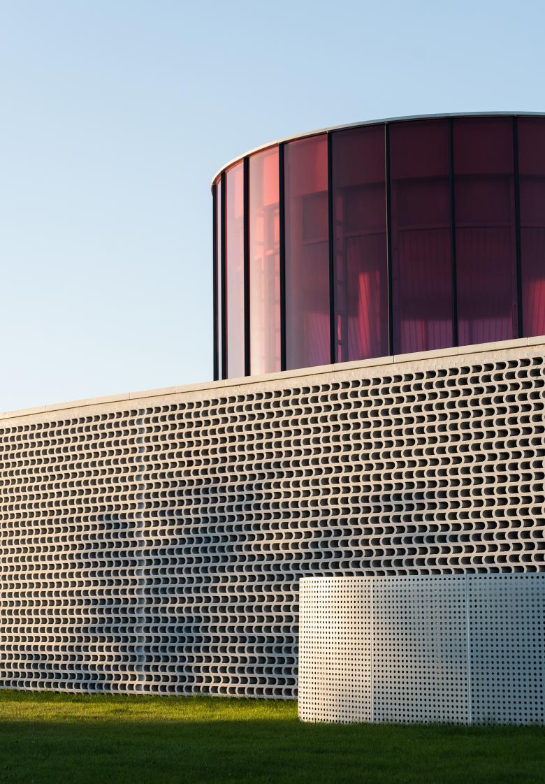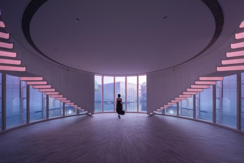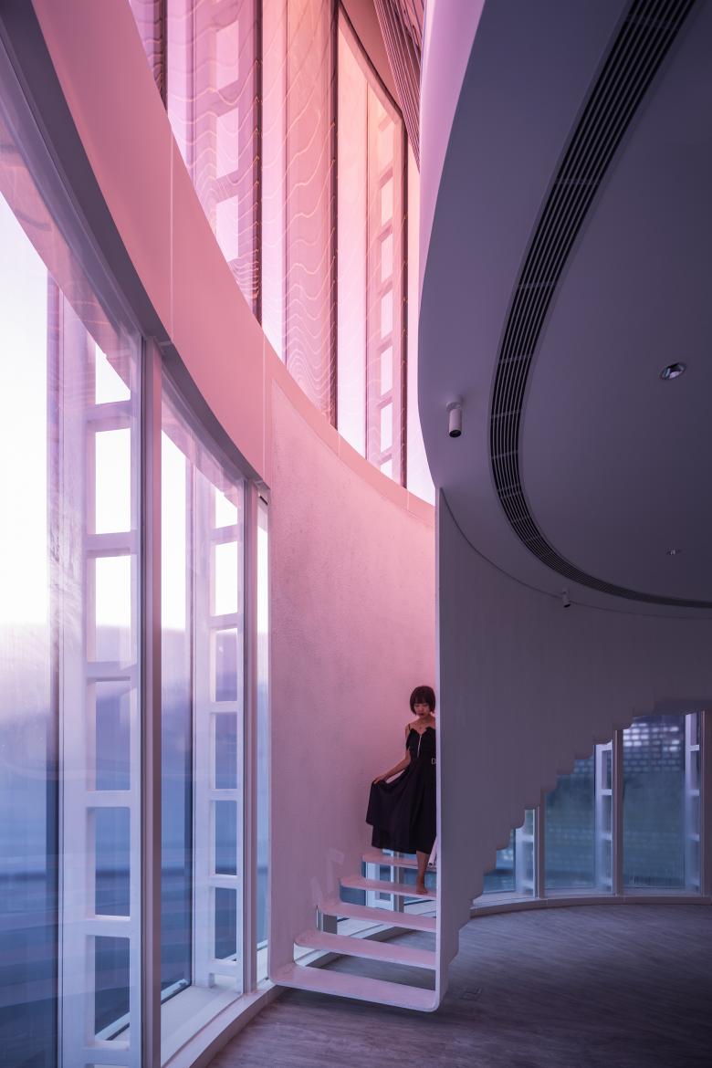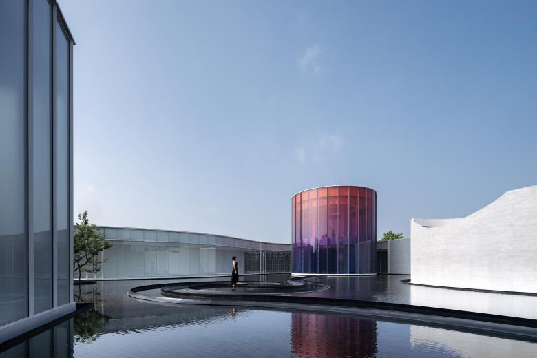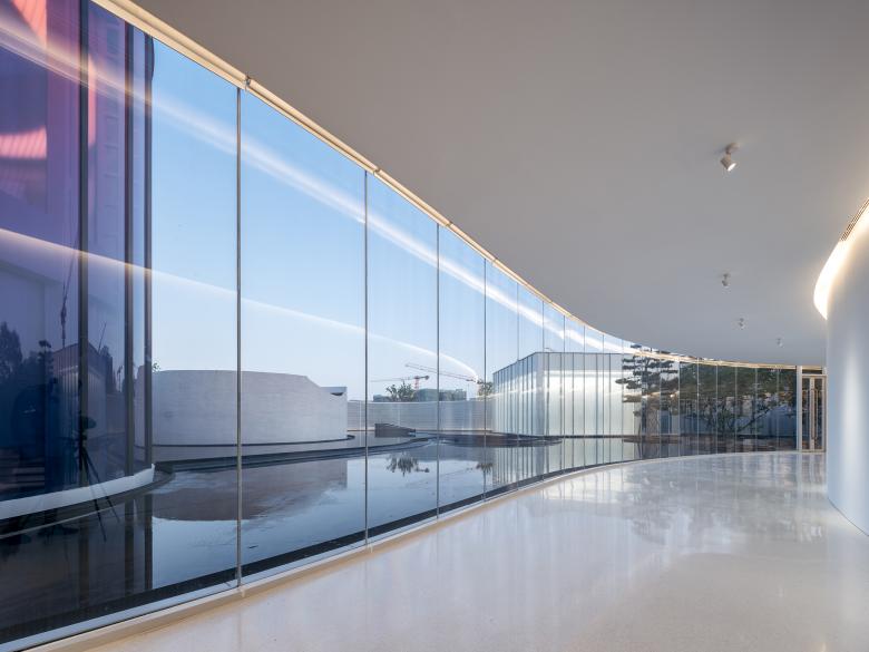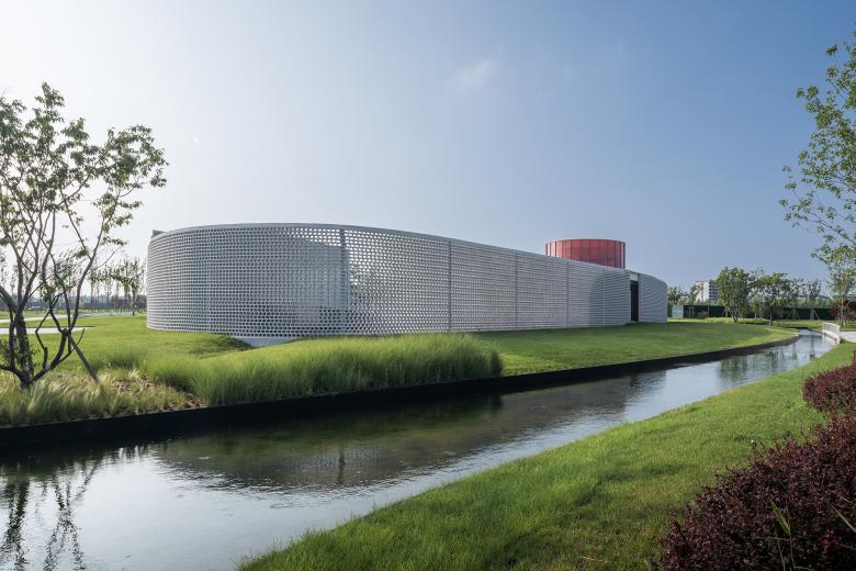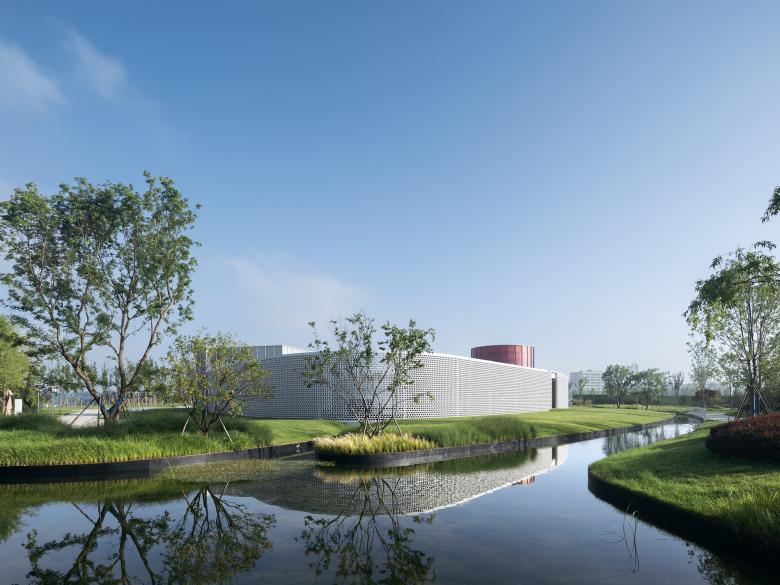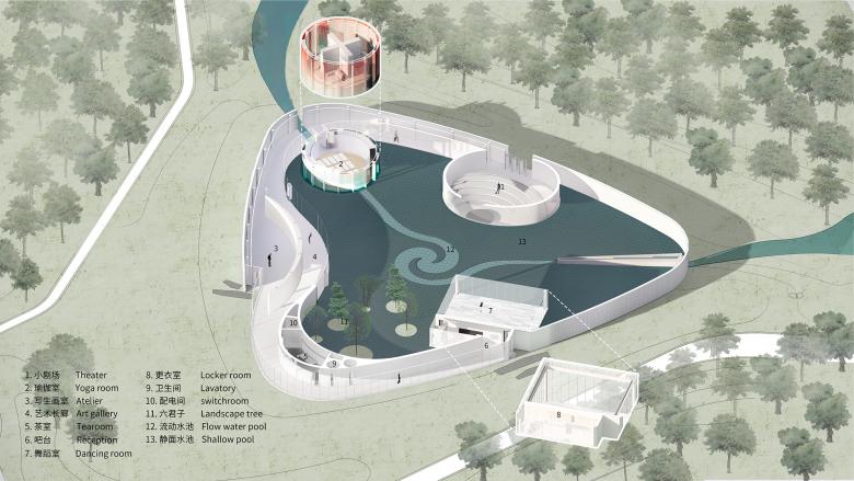 Separated from the main steel structure, the small theater is shaped by a continuous closure of the reinforced concrete wall panel structure, an elliptical column standing on the pool. The inside is noisy while the outside is quiet.