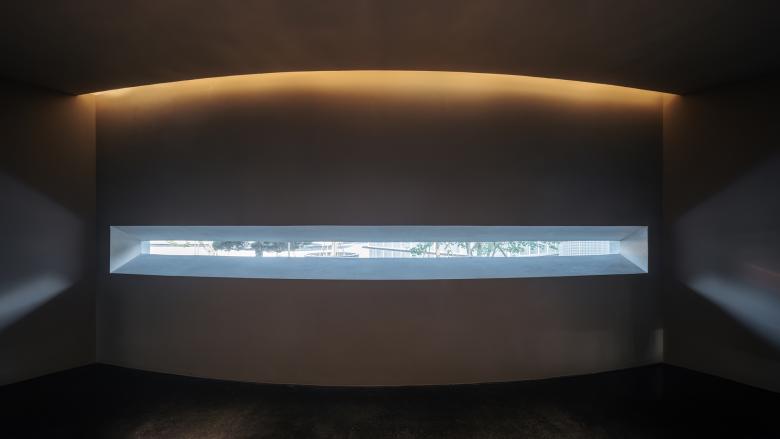 I divided a single wall in two to form a tearoom hidden behind the back wall of the corridor, just like the white gap we leave between the brushstrokes. It is an intimate and silent space, a corner where we hide our thoughts. I opened a long horizontal window along the height of the sight line to frame the sight as a scroll, where the six gentlemen were revealed. “Staring at each other while silent fell, remaining speechless only time can tell.”