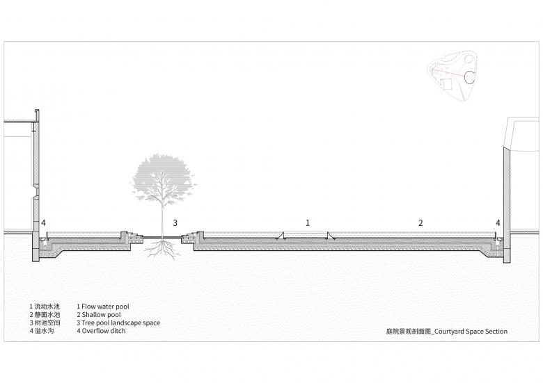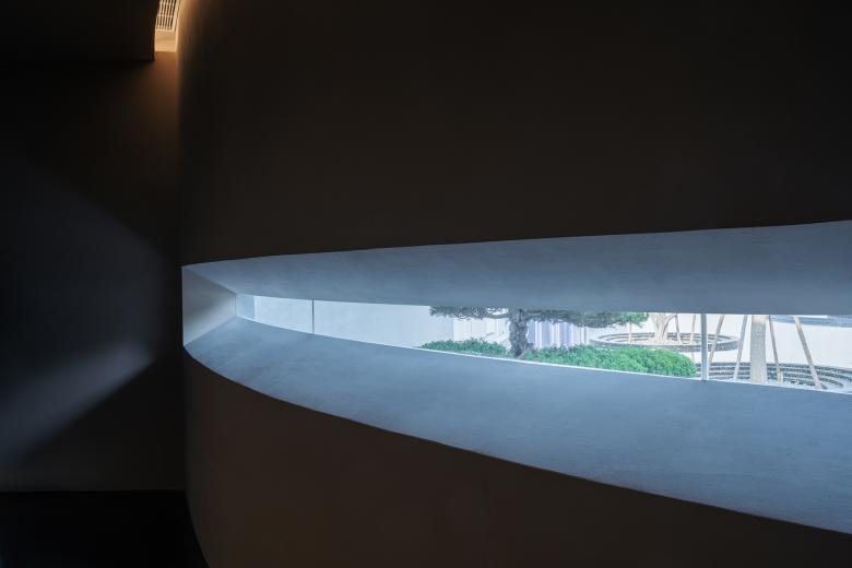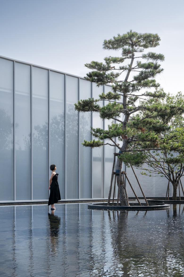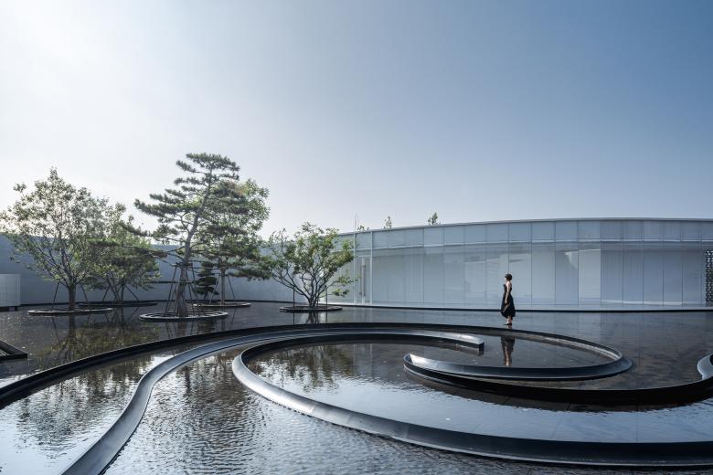 However, I did not eliminate the landscape water system in the original courtyard that takes the meaning of Winding Stream Party. I wanted the design of this flowing water to become a surging current in the calm water courtyard, forming the design of water within water. The water flows from the plunge into the center of the courtyard, spirals and twists, then flows toward the yoga room, connecting with the external water system under the foundation of the building, and finally quietly flowing into the sea. This connects the self-contained Monologue Art Museum to the Yellow Sea.