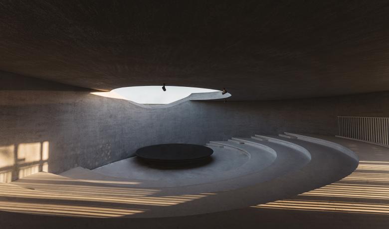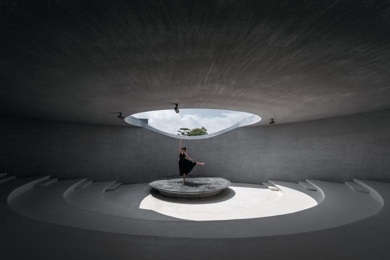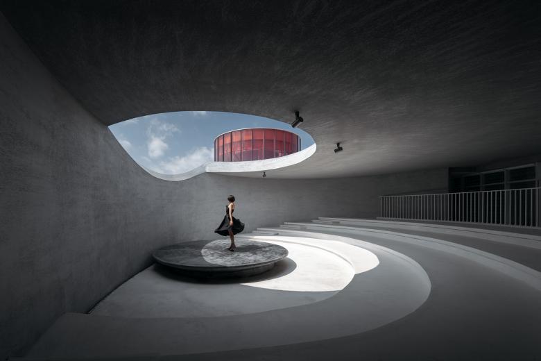 The small theater is the foyer of the Monologue Art Museum. To reduce the floor area for calculating the floor area ratio, it was designed as a flex space. At the same time, to keep the audience's attention on the performance and not to dramatize the central water scene, the small theater was designed as a closed space. I cut a curved skylight above the back of the stage to allow daylight or moonlight to spill down like a waterfall, "There is a crack in everything, that's how the light gets in."
