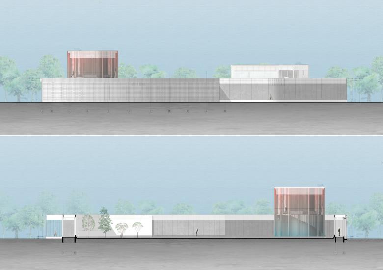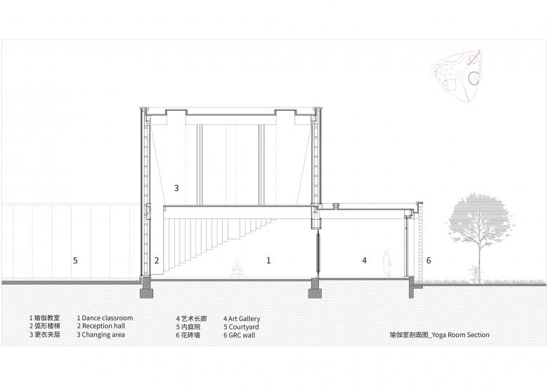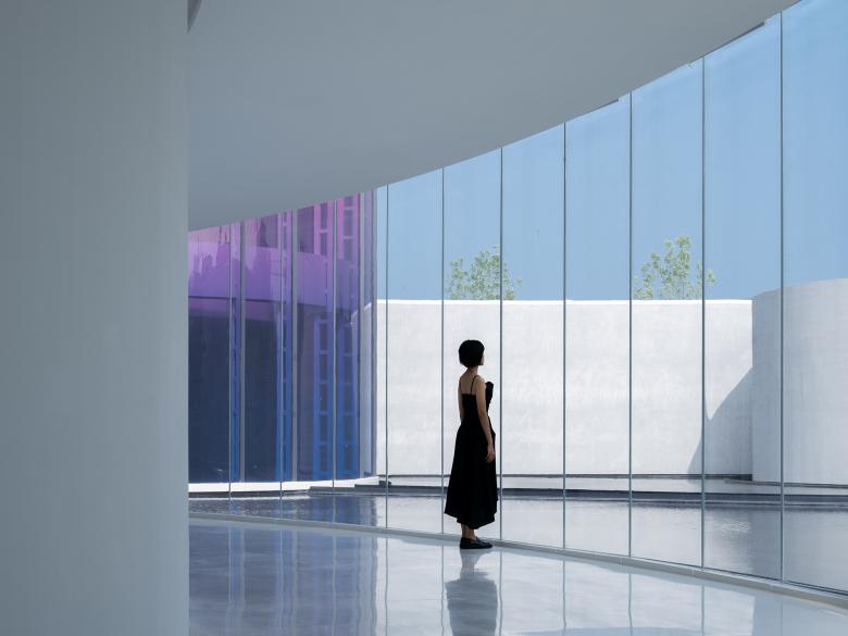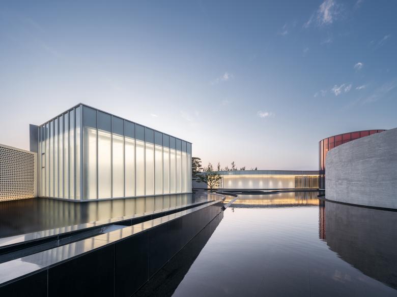 The Monologue Museum is a slowly unfolding hand scroll. Starting from the small entrance theater where the light breaks through the corners, entering the art gallery, the quiet water courtyard slowly reveals itself along the open corridor with shifting lights, passing through the colorful yoga room to the bright art gallery (exhibition and painting rooms). Then the light fades, the path gets narrower, and you almost miss the tearoom hidden behind the wall. At the end, there is a dance studio. When you exit the building, you continue along the flower wall and wade through the water in the dappled shadows. The water runs through the center and diving the building, seemingly towards the sea. When I came across the small theater again, I saw six trees by the water, whispering and shaking their heads in the breeze. All the scenery including sounds and thoughts slowly unfolded into paintings.