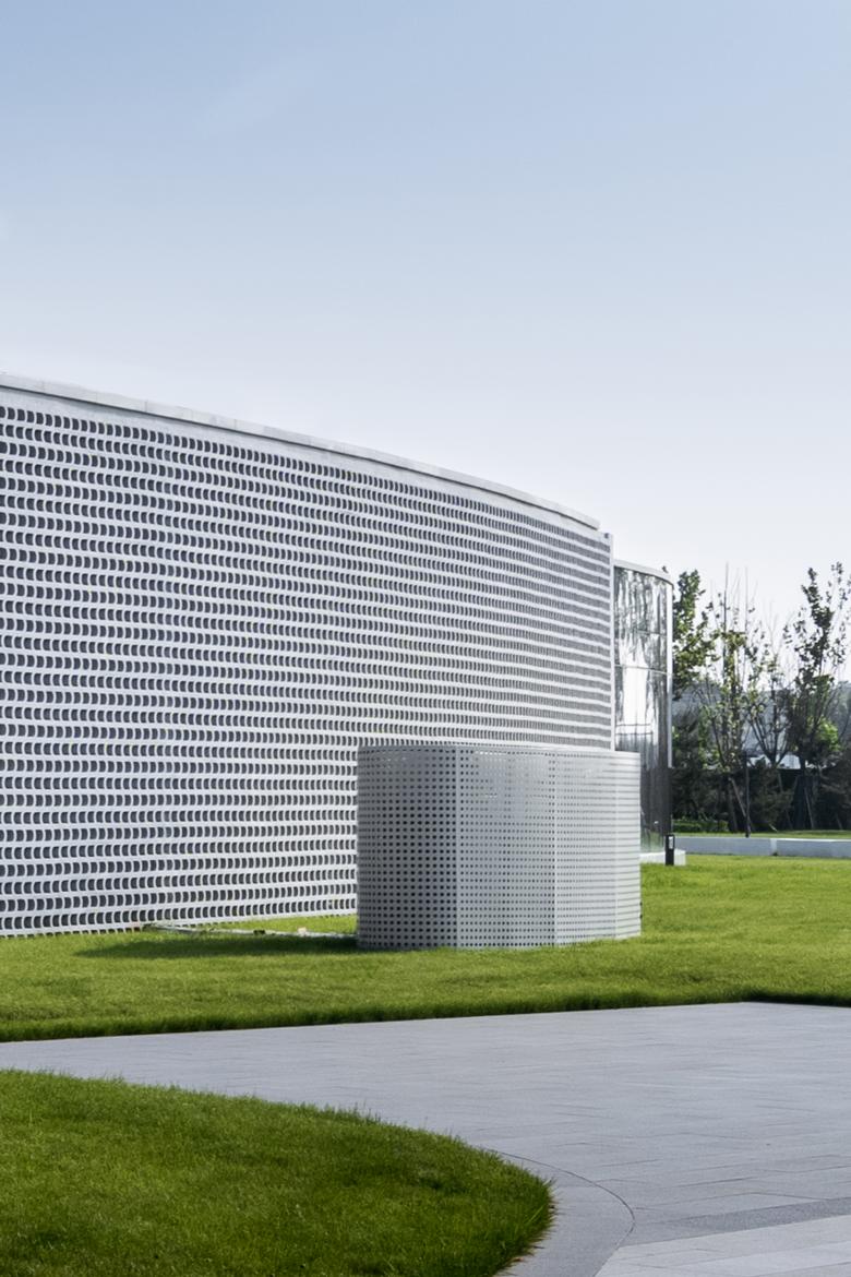 The client suggested that turn the equipment room into a tearoom. Then the equipment had to be placed outside in two groups, one in the courtyard and the other one in the green space outside the gallery. I designed a leaf-shaped perforated aluminum baffle to hide the equipment. The equipment was turned into an installation for the Monologue Art Museum.
