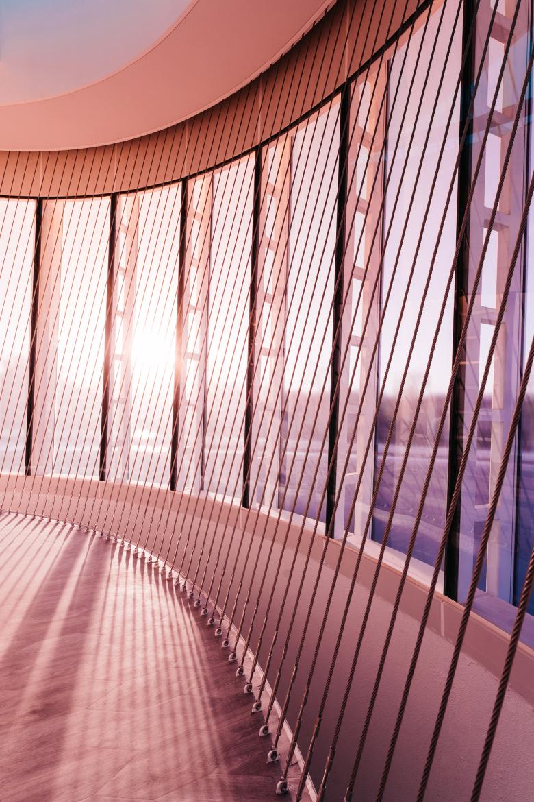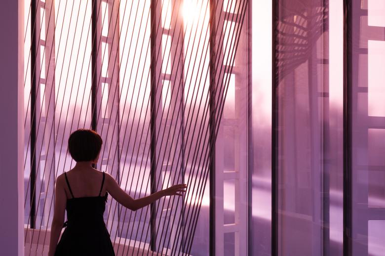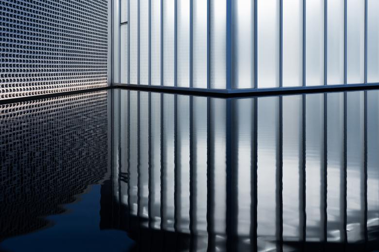 The water courtyard has quieted down. When I looked at the white building with a glass façade on the edge of the black pool in the rendering, a new familiarity arose, and the atmosphere of the place was too clichéd. So, I decided to light it up by turning the highest circular yoga room facade into a gradient of stained glass. With a touch of color in the thick ink, there comes a glittering glass fortress.